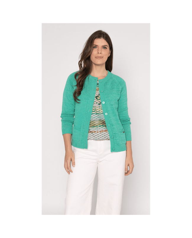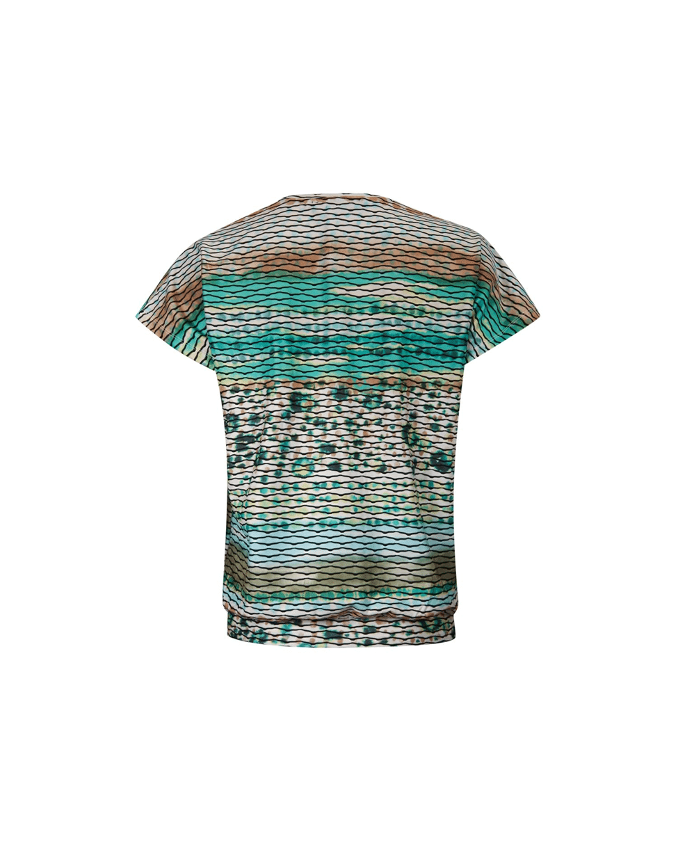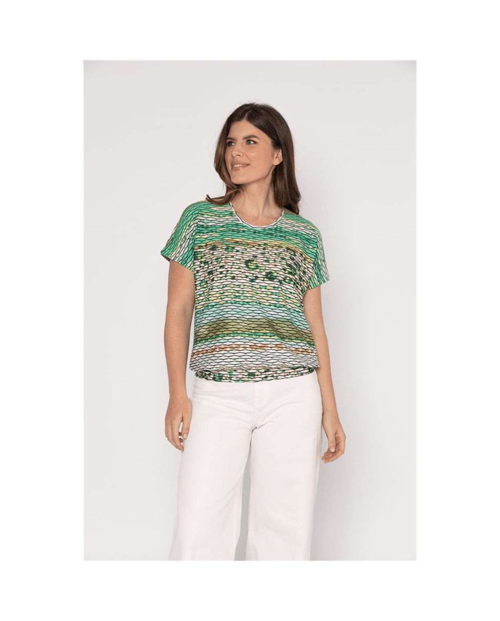 Luchtige blouson top met ronde hals van Roberto Sarto in een opvallende green brush stroke print. De combinatie van strepen en zachte kleurovergangen geeft dit dames T-shirt een moderne, artistieke uitstraling. Ideaal voor een zomerse dag met een lichte broek of rok.
