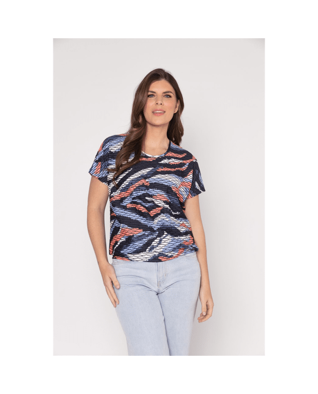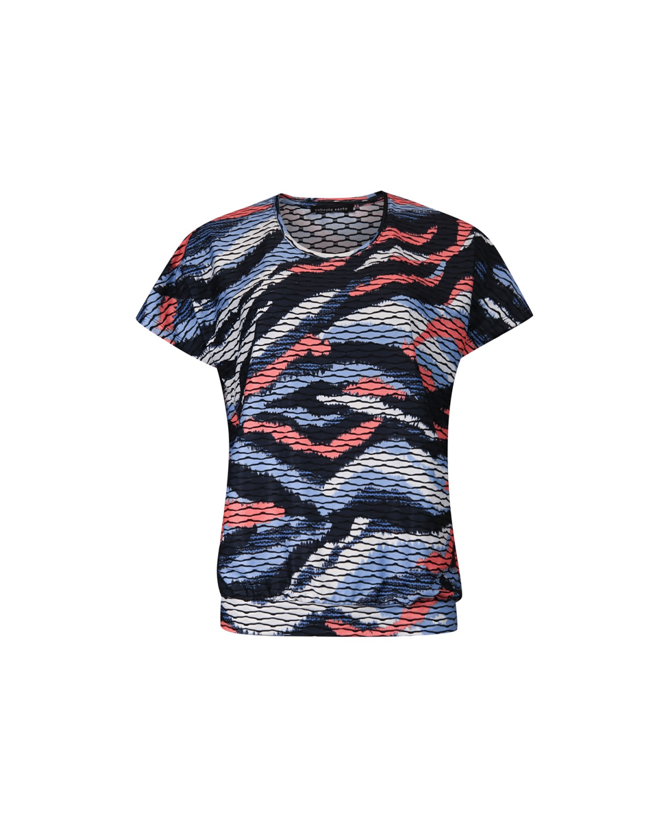 Deze dames blouson met ronde hals in sky en coral colour swipes print geeft je outfit direct een frisse, energieke uitstraling. De combinatie van blauw, navy en koraal zorgt voor een speels kleuraccent in je voorjaars- en zomergarderobe.