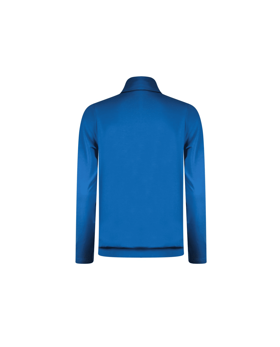Blousonmodel met kleine col en subtiele plooitjes bij de hals. Gemaakt in Dutch blue en afgewerkt met een elastische zoom die mooi op de heup valt. Een vrouwelijke basic met een zachte uitstraling.