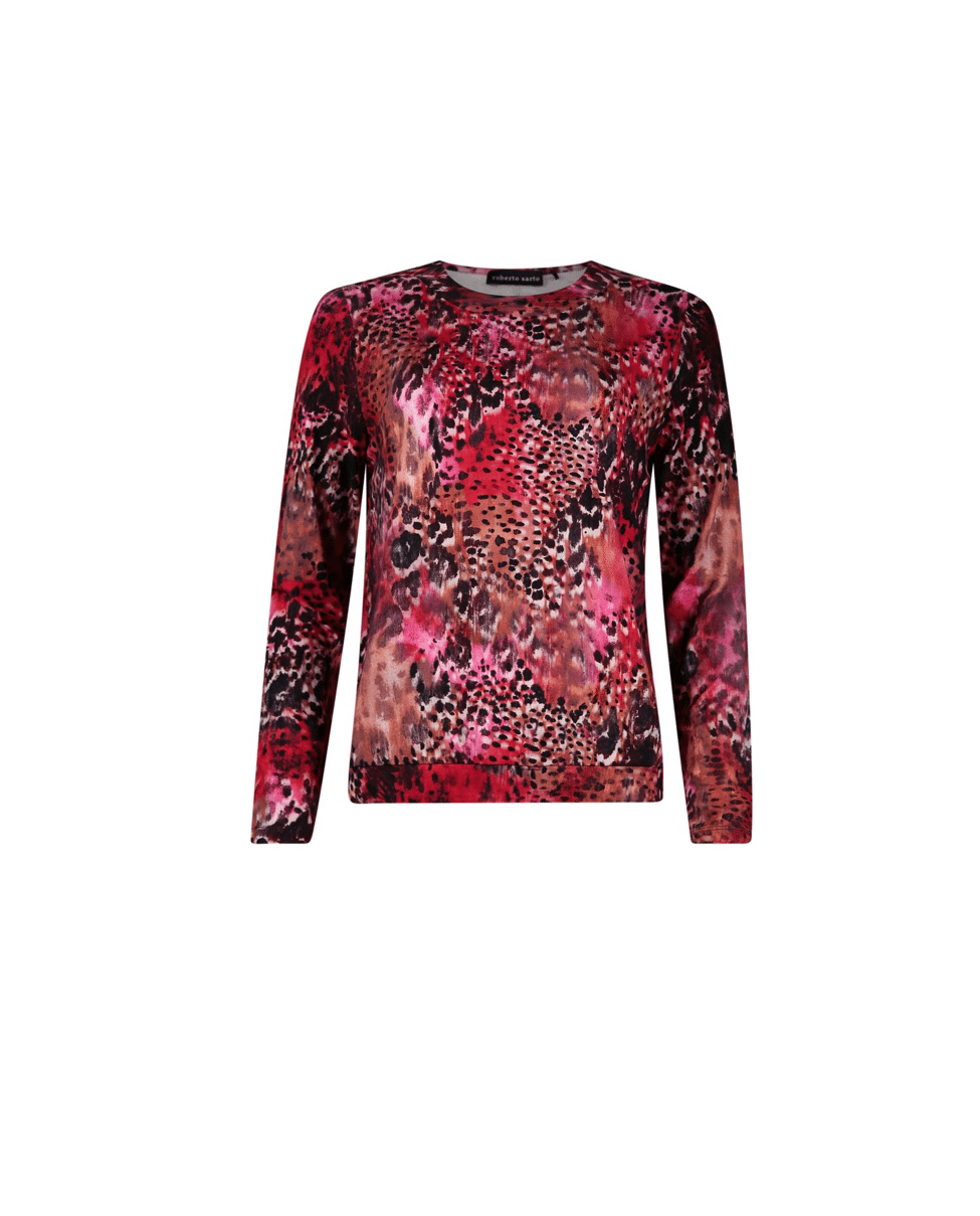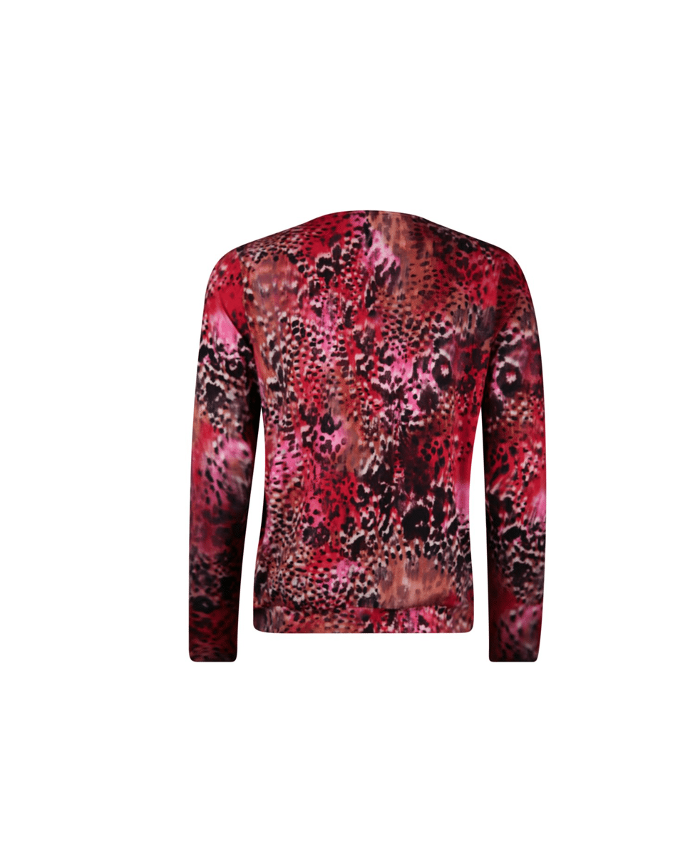 Een blouson T-shirt met elegante ballethals in een scarlet-black faded animal print. Het model heeft een fijne onderboord die zorgt voor een mooie pasvorm op de heup.