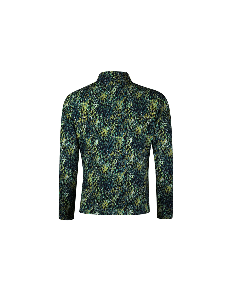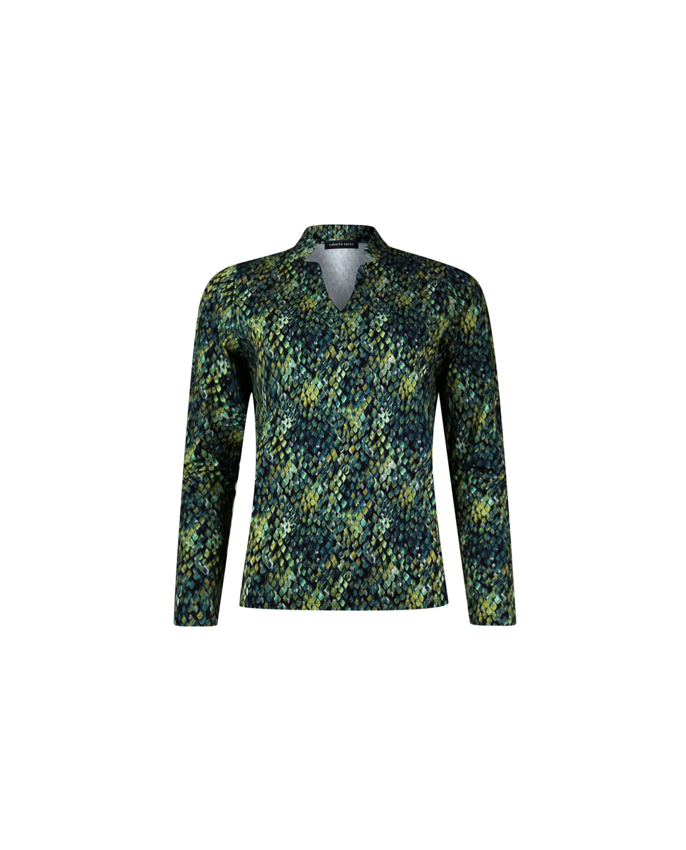Een T-shirt met V-hals en klein opstaand boordje, uitgevoerd in green snake skin minimal print. Het model heeft driekwart mouwen en een soepele pasvorm – ideaal voor het najaar.