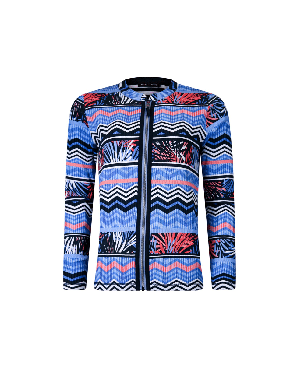 De opvallende print in combinatie met de effen contrastbies langs de rits zorgt voor een krachtige, maar draagbare look. Ideaal als licht vest over een top of shirt.