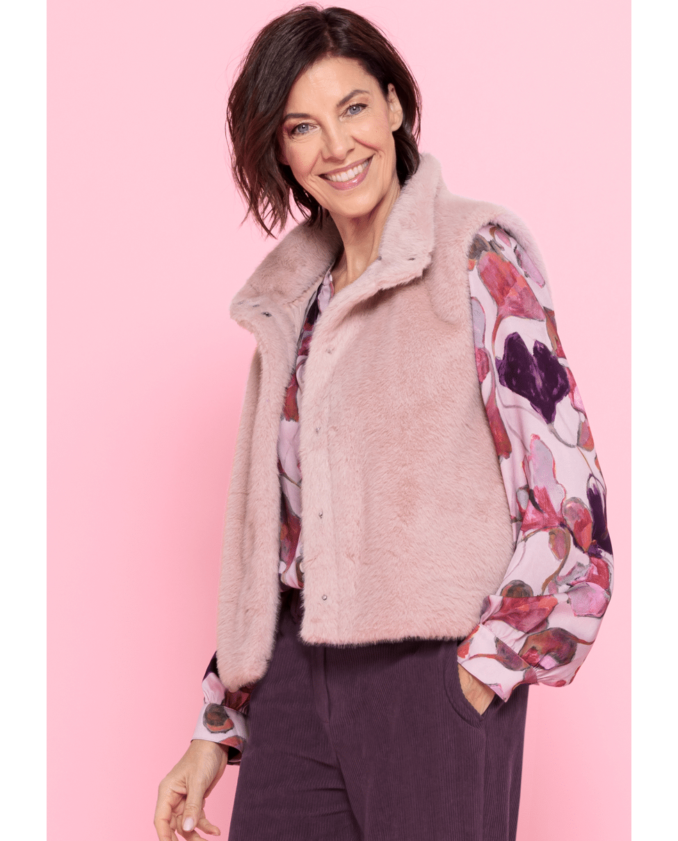 Deze bodywarmer van imitatiebont is zacht, stijlvol en heerlijk warm. Perfect voor frisse herfstdagen of als cosy laagje binnen.