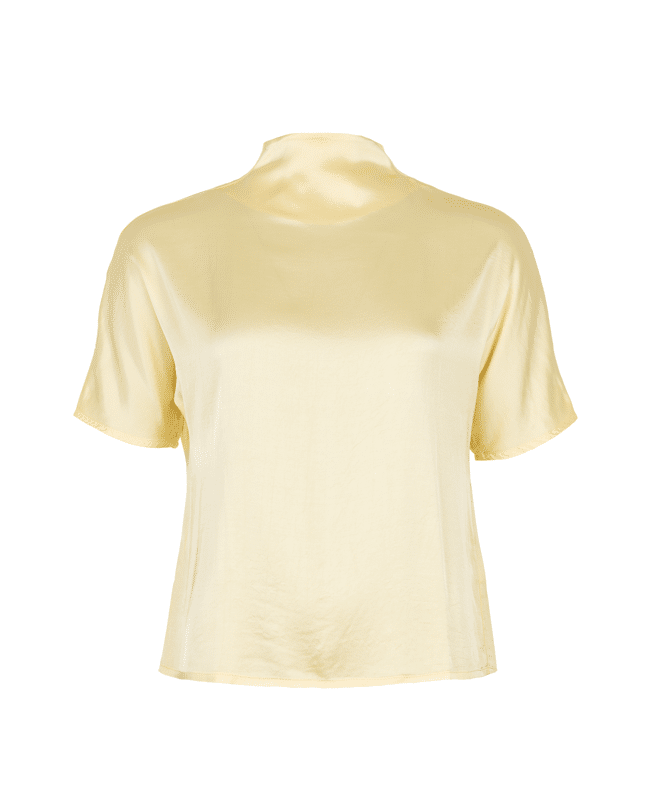 De lichte glans en soepelvallende stof maken dit een top die net wat chiquer oogt, maar net zo comfortabel draagt als je favoriete basic. De zachte gele tint geeft elke outfit warmte.