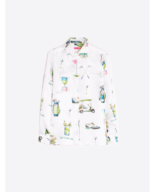 Deze Tea damesblouse van Vilagallo combineert een frisse witte basis met een speelse Silk Golf print vol verfijnde illustraties. Een stijlvol statement voor wie houdt van detail, kleur en een knipoog.