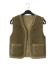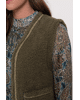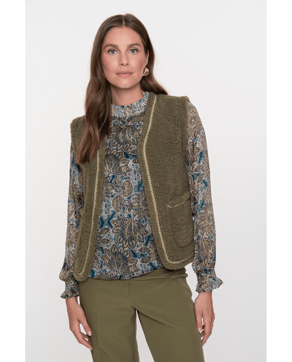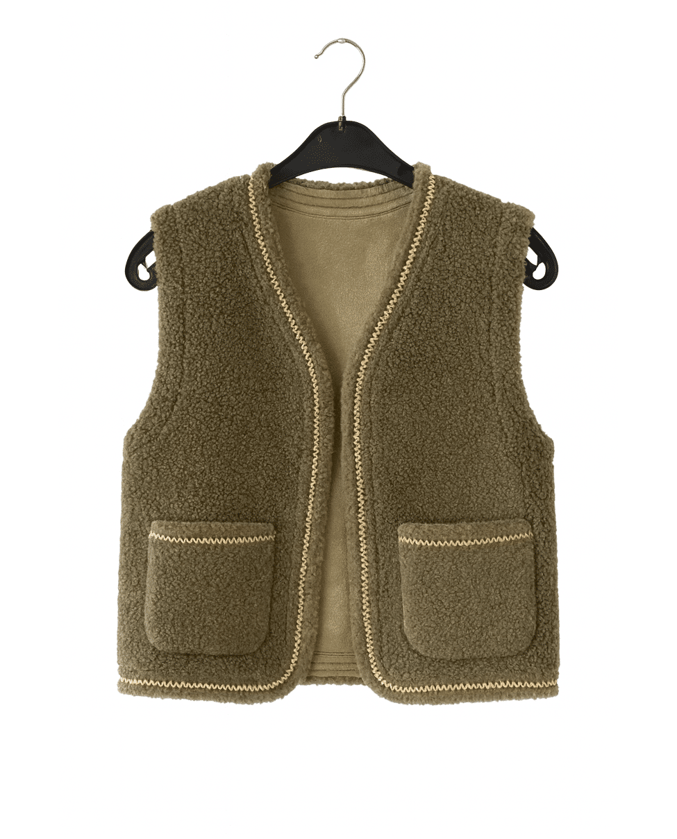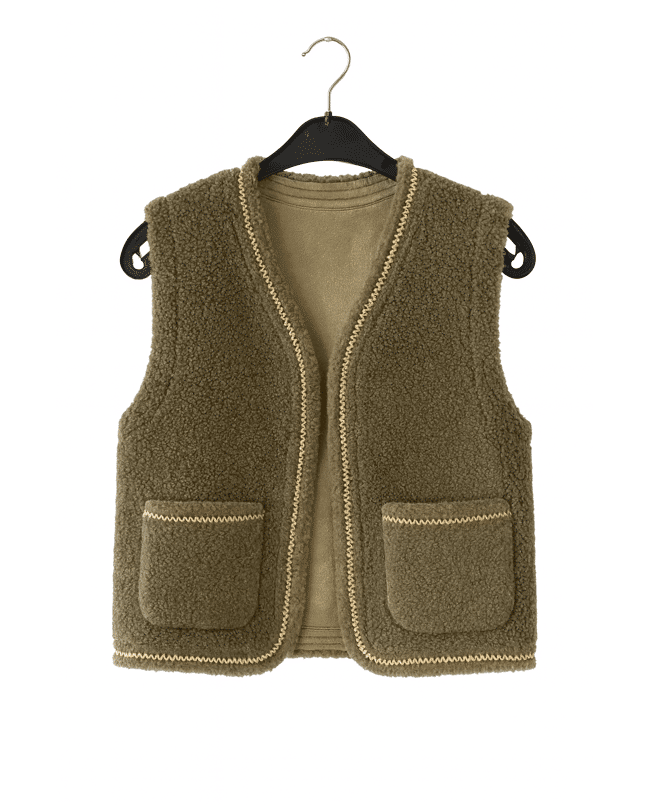 De decoratieve stiksels en diepe kleur maken dit gilet net even anders. Combineer over een trui of jurk voor extra warmte en stijl.