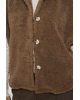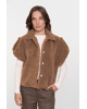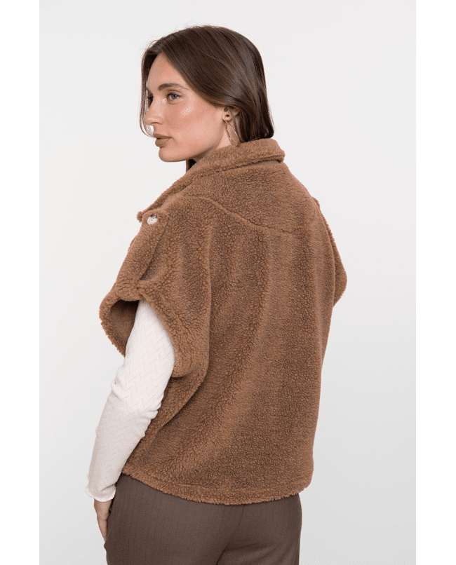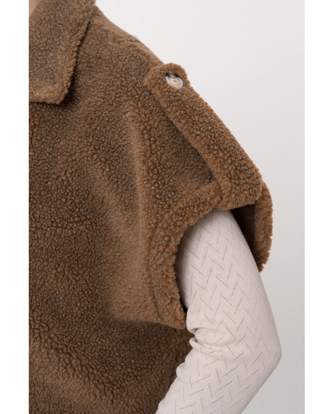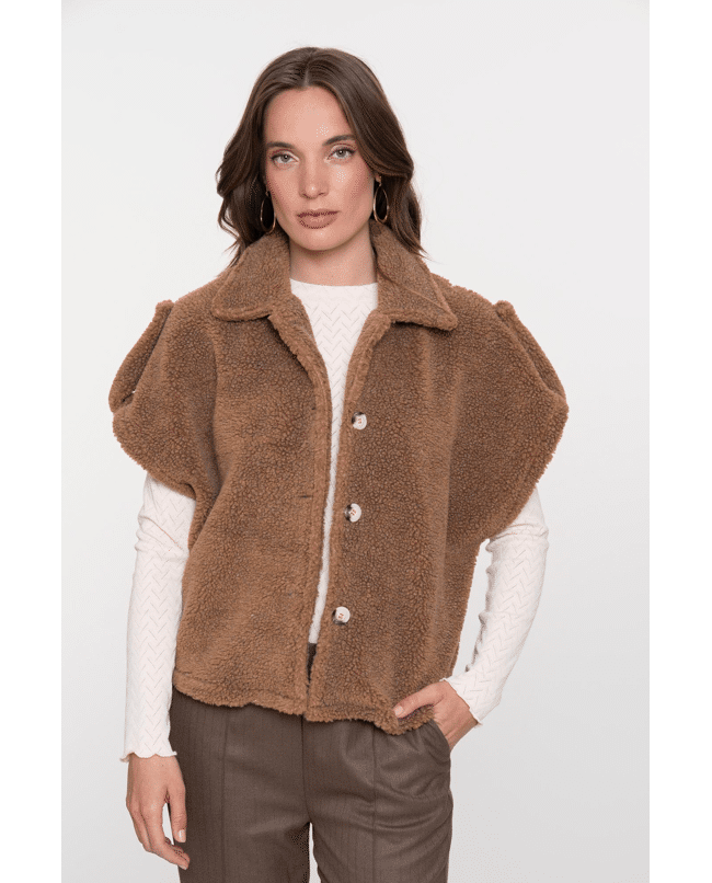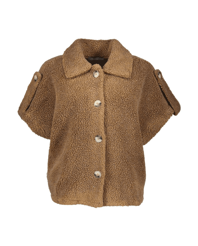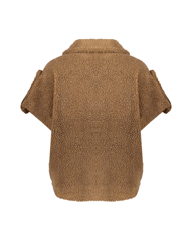 Zacht teddy jasje in camel – een cosy laagje met opvallende schouders. Perfect voor het tussenseizoen of om binnen stijlvol warm te blijven.