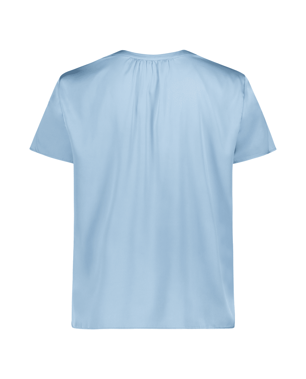 De soepele satijnstof en V-hals met plooien geven deze blouse een elegante flow – simpel maar chic.