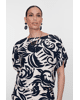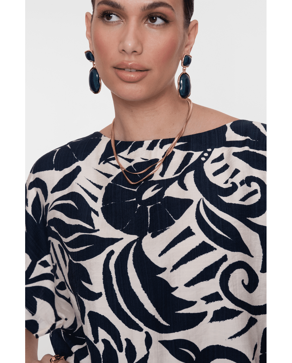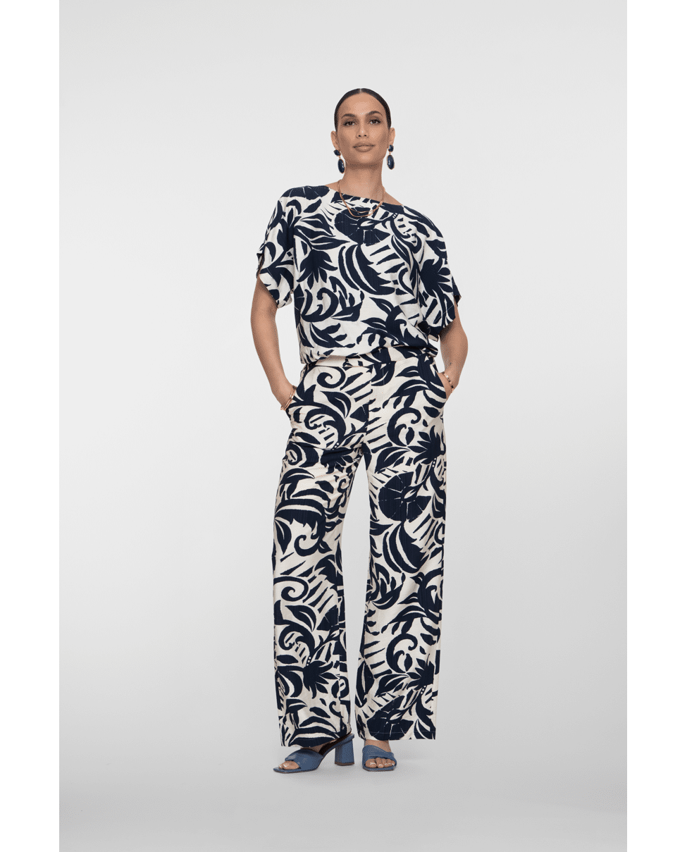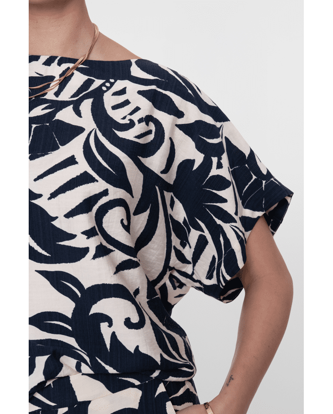 De navy bloemenprint springt eruit op de off-white basis en geeft direct een zomerse vibe.