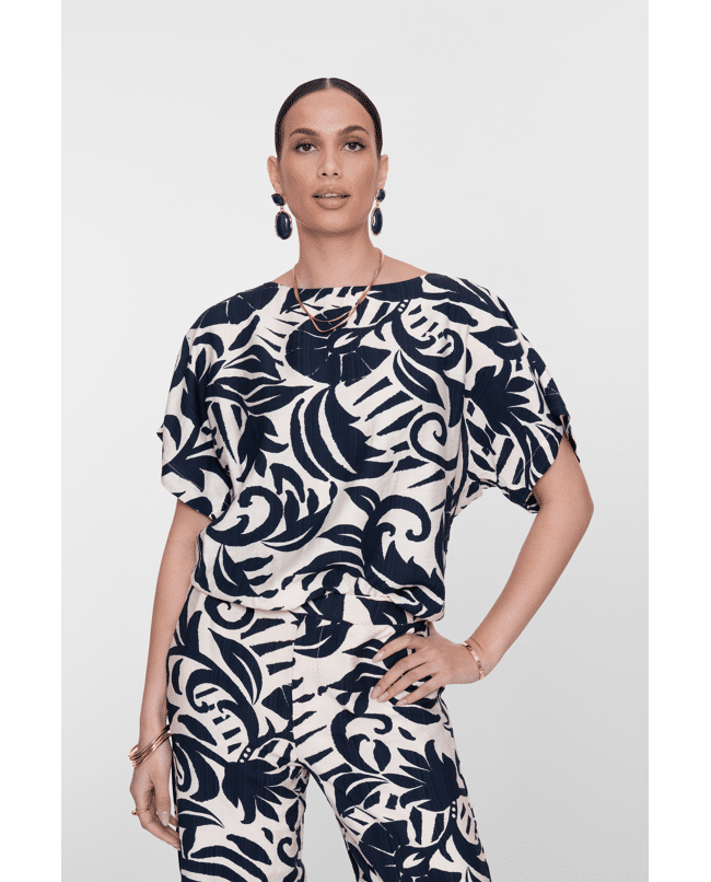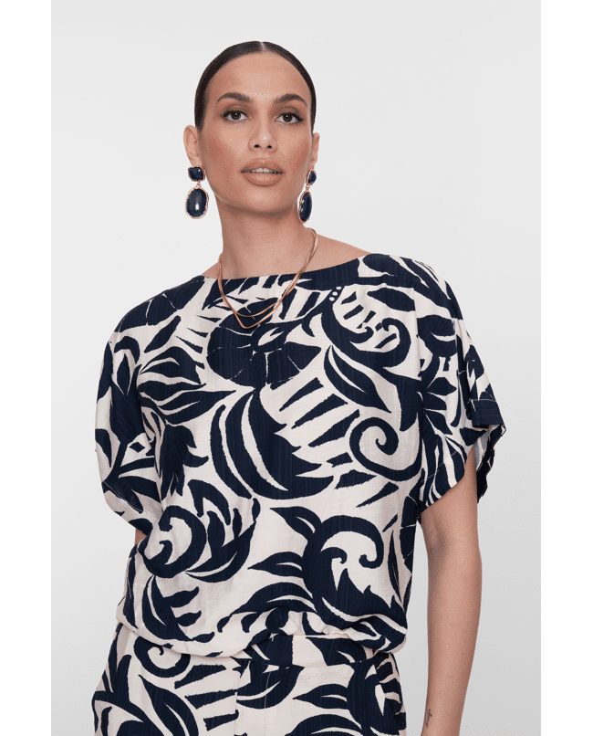 Deze soepelvallende top met elastische zoom en korte mouw is ideaal voor warme dagen waarop je er stijlvol én comfortabel uit wilt zien.