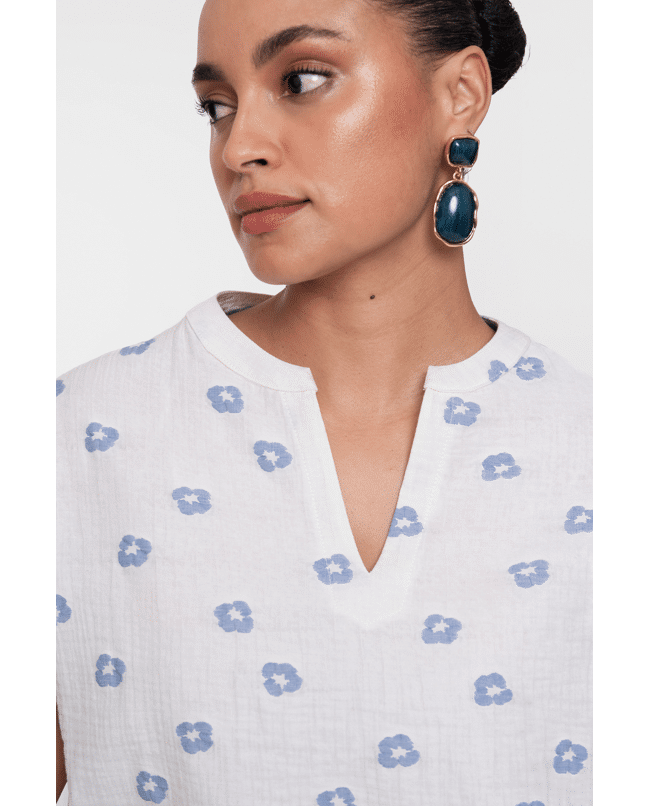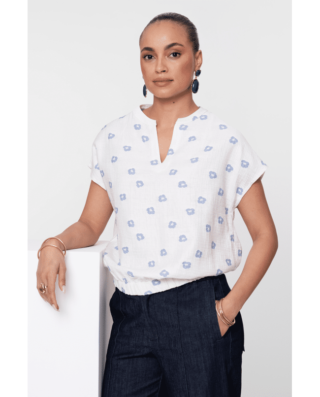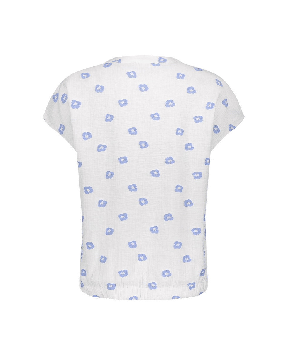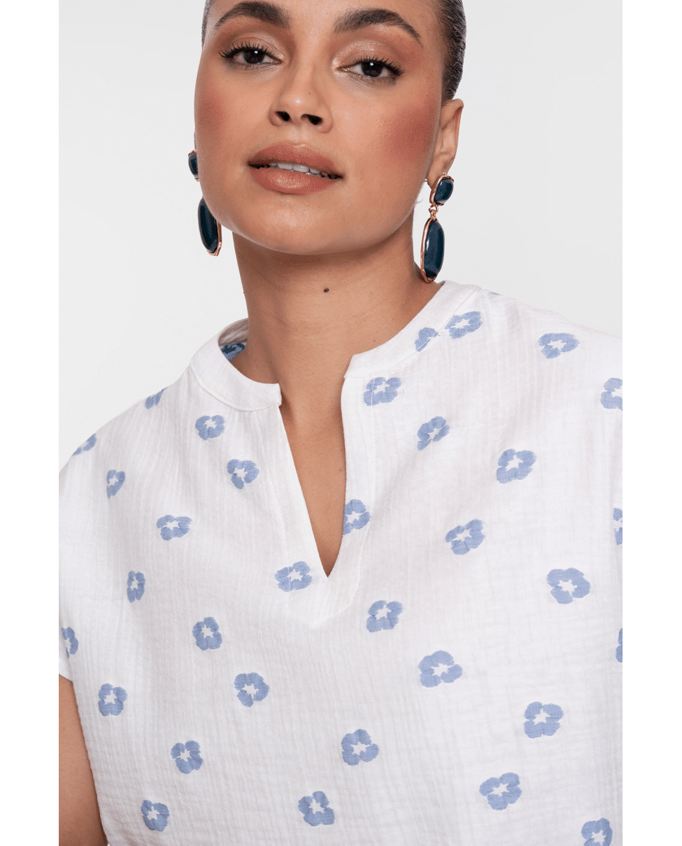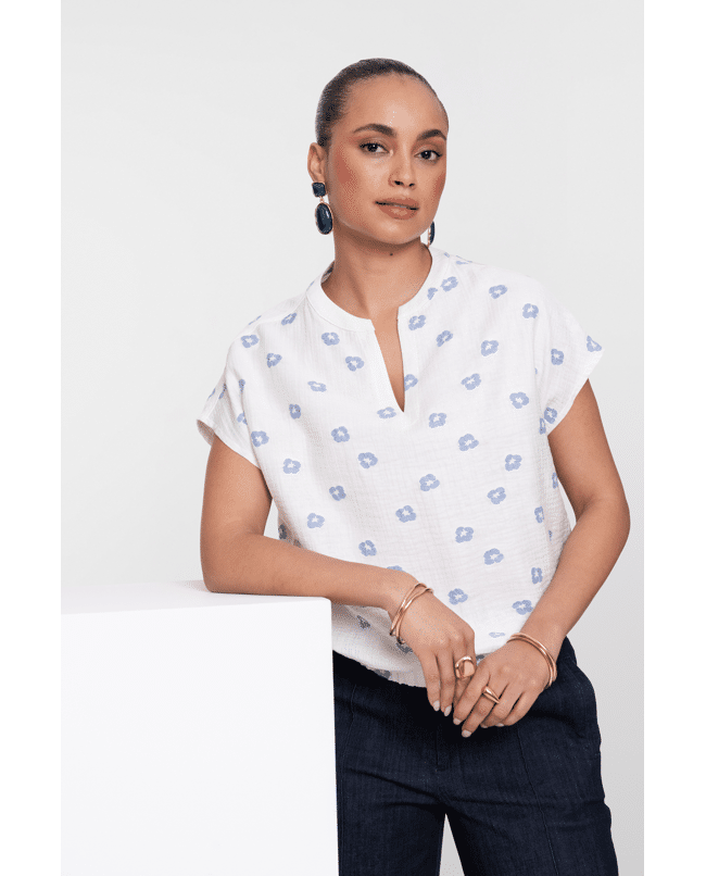 De lichte structuur en fijne geborduurde bloemetjes geven deze top een speels en fris karakter.