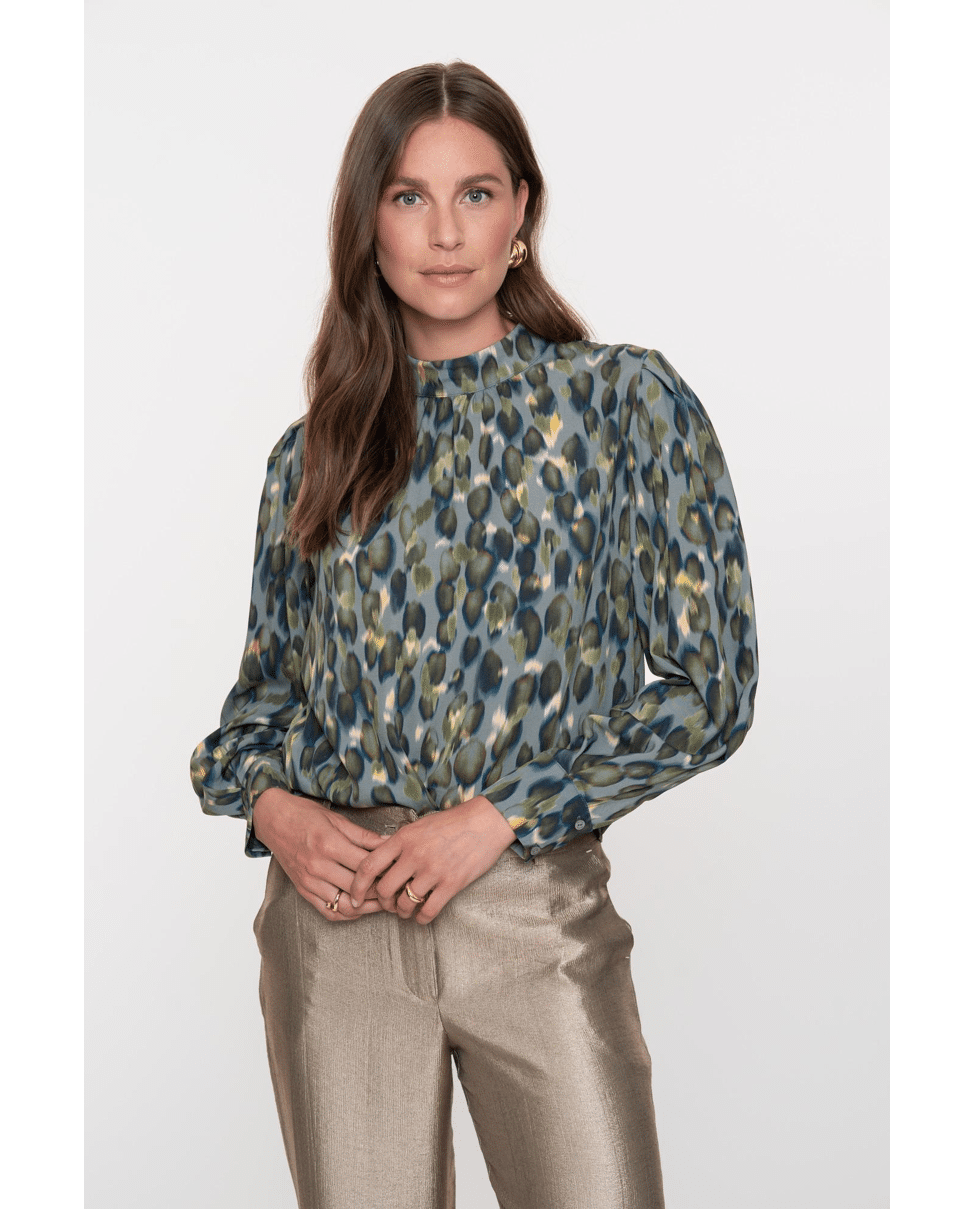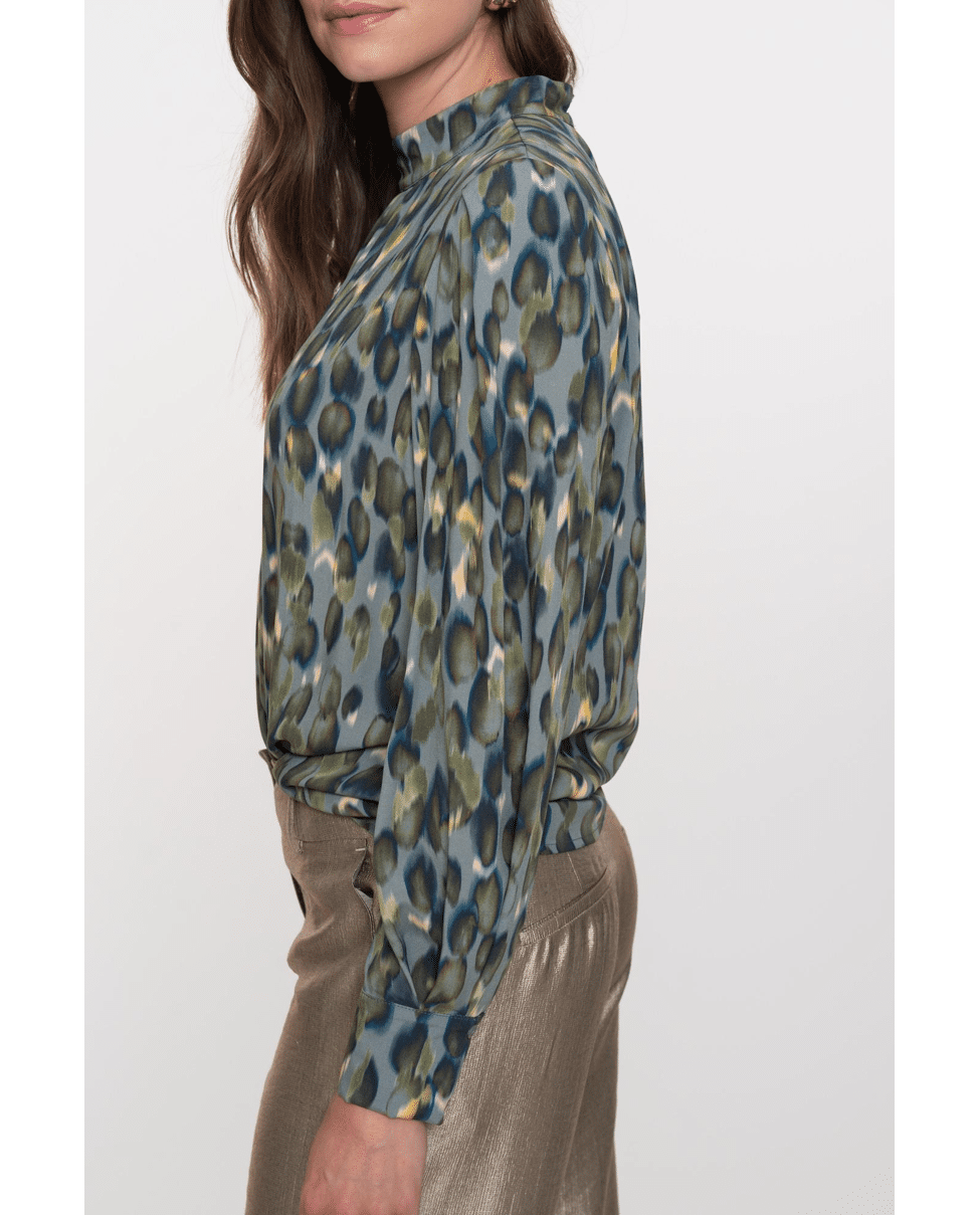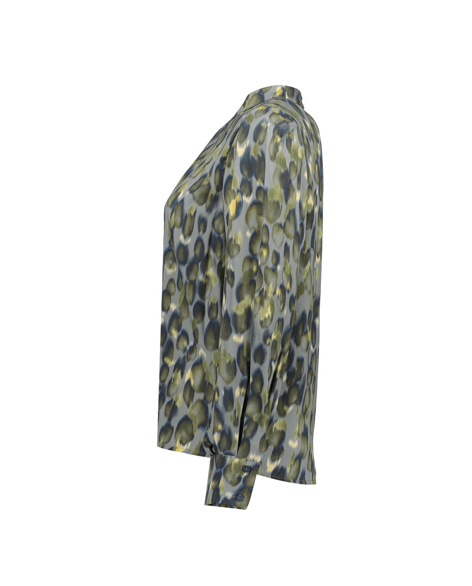 Deze top in grijs en olijfgroen heeft een speelse print en vrouwelijke plooien. Mooi onder een blazer of gewoon los op een jeans.