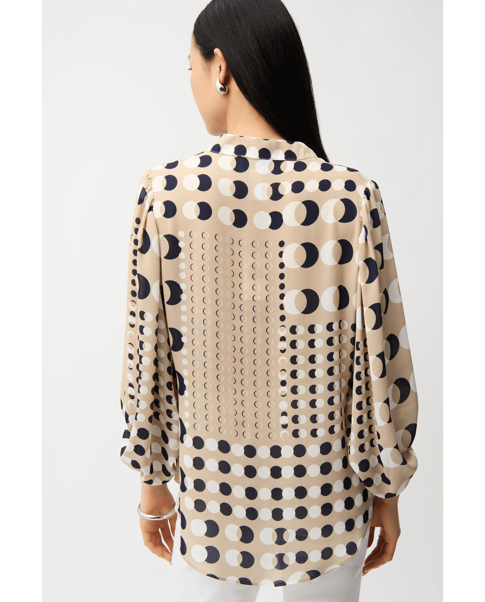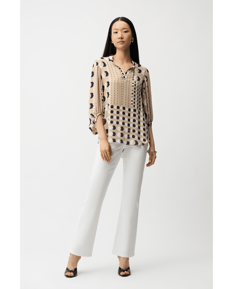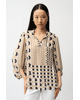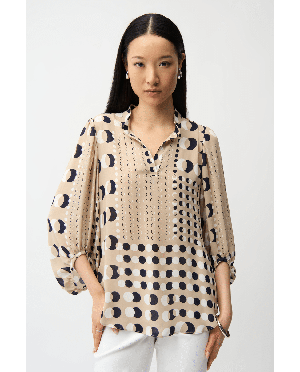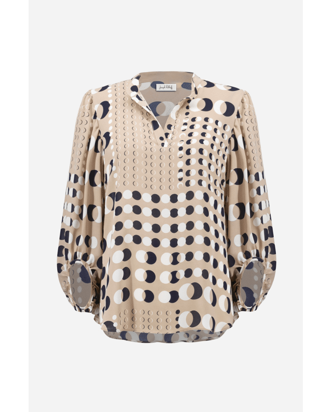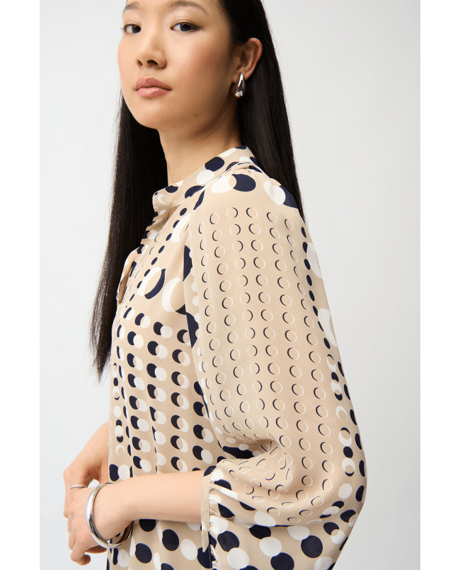 Damestop van Joseph Ribkoff met stippen print, opstaande kraag met splithals driekwart pofmouwen