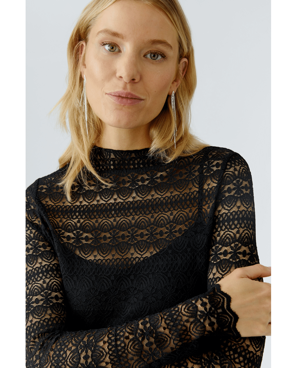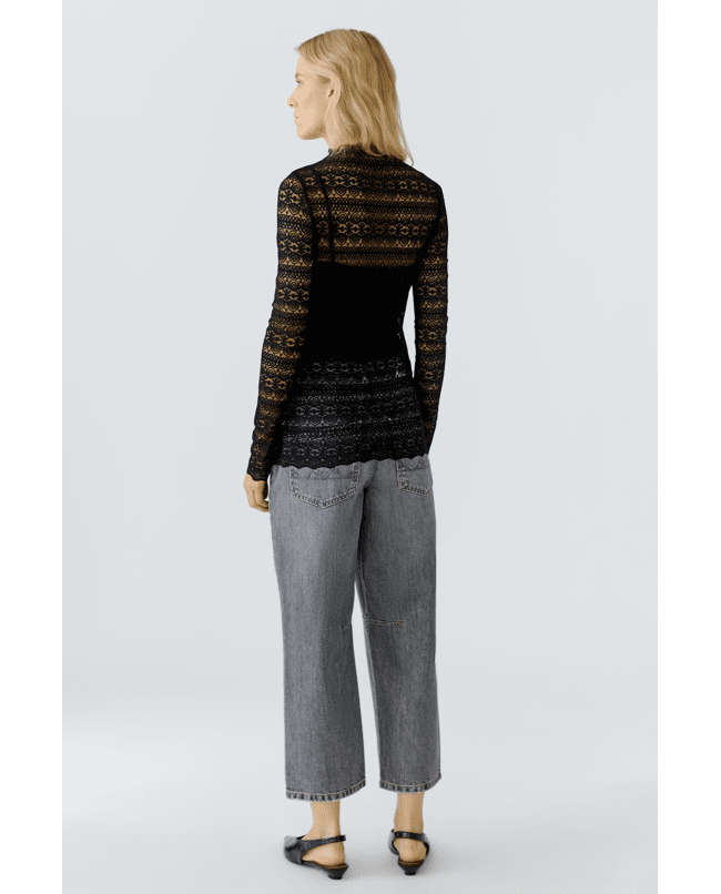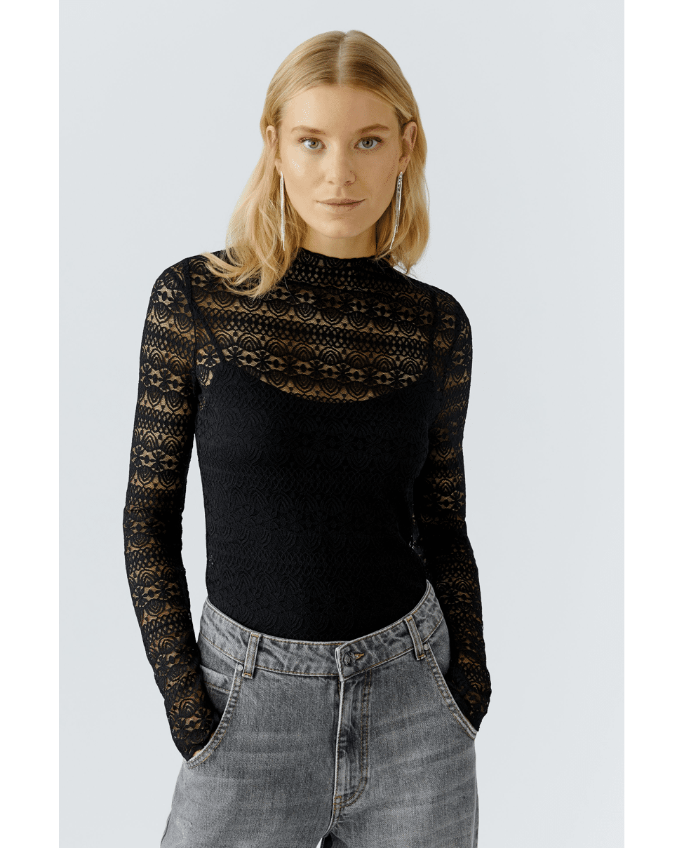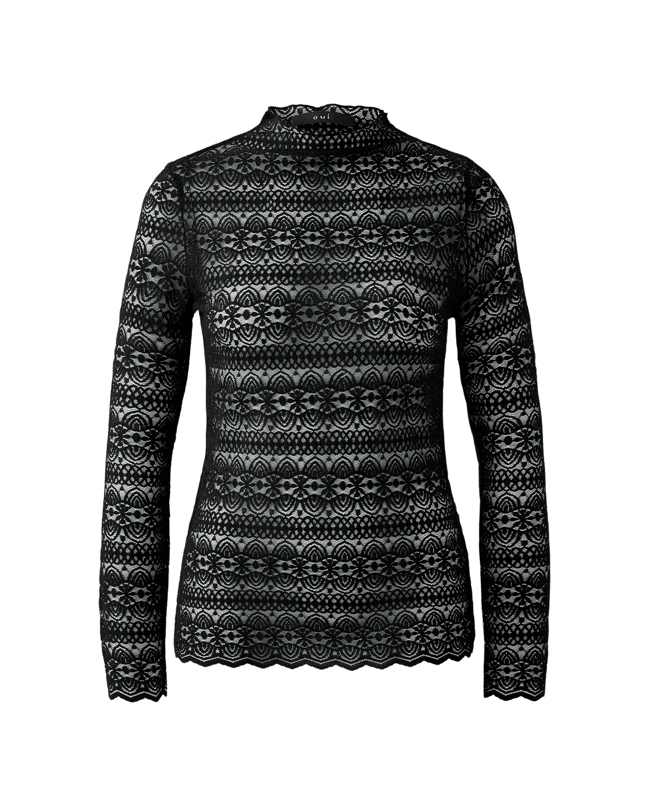 Deze zwarte top van Oui is een elegante essential met semi-transparant kant. De opstaande halslijn en lange mouwen maken dit item zowel vrouwelijk als stijlvol.