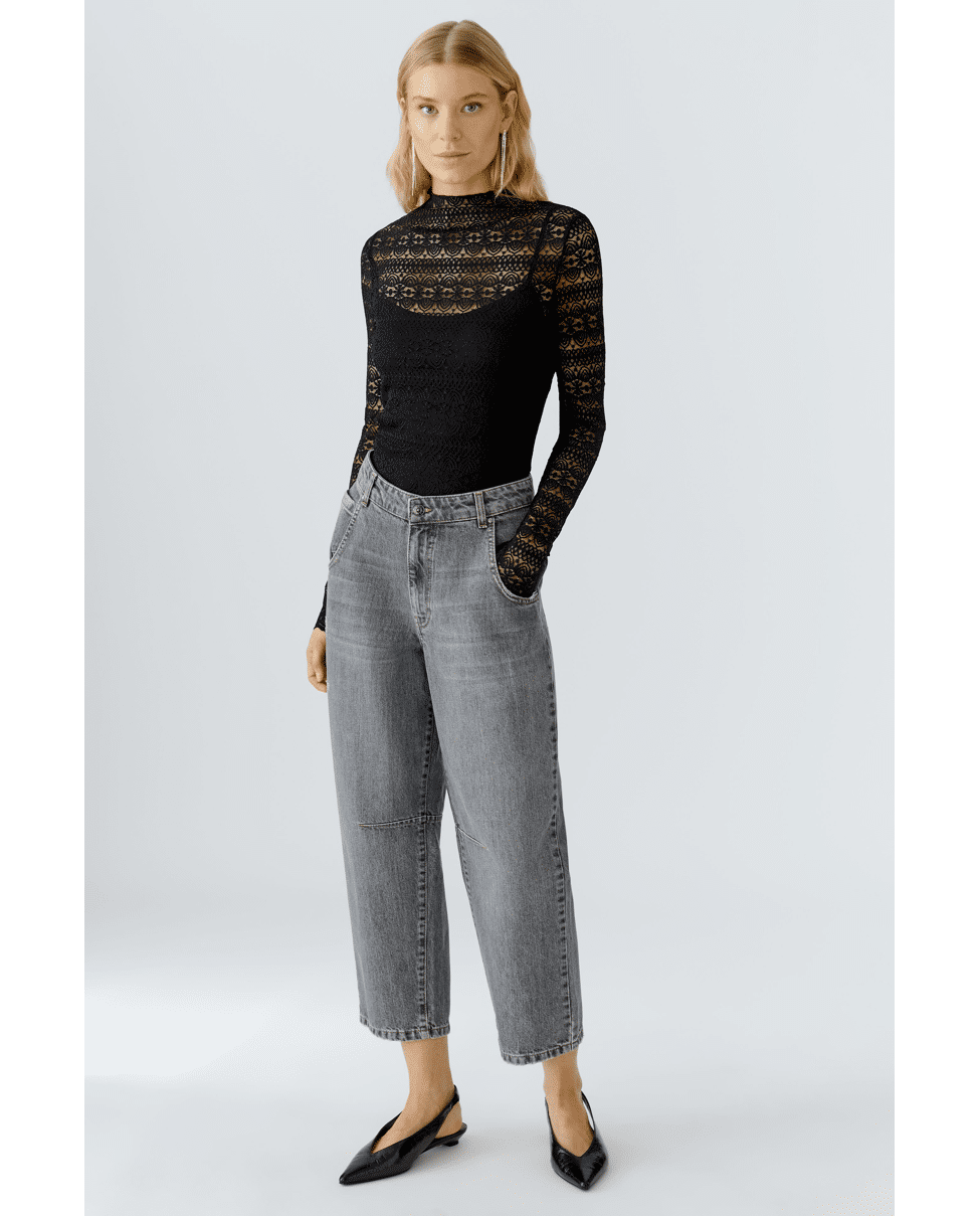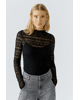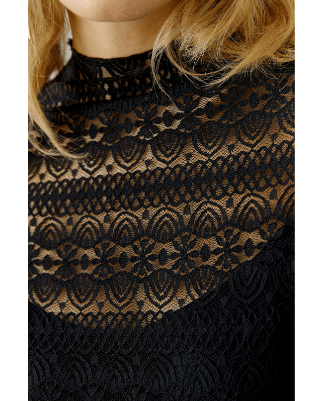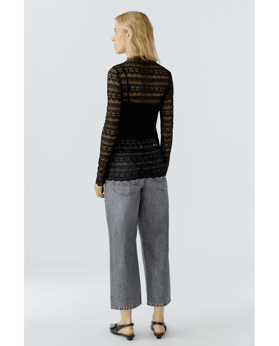 Deze zwarte top van Oui is een elegante essential met semi-transparant kant. De opstaande halslijn en lange mouwen maken dit item zowel vrouwelijk als stijlvol.