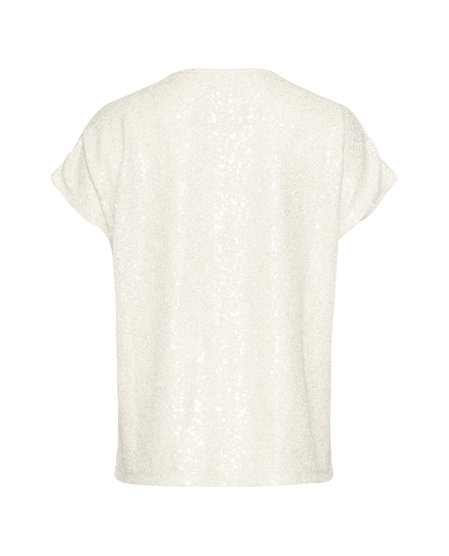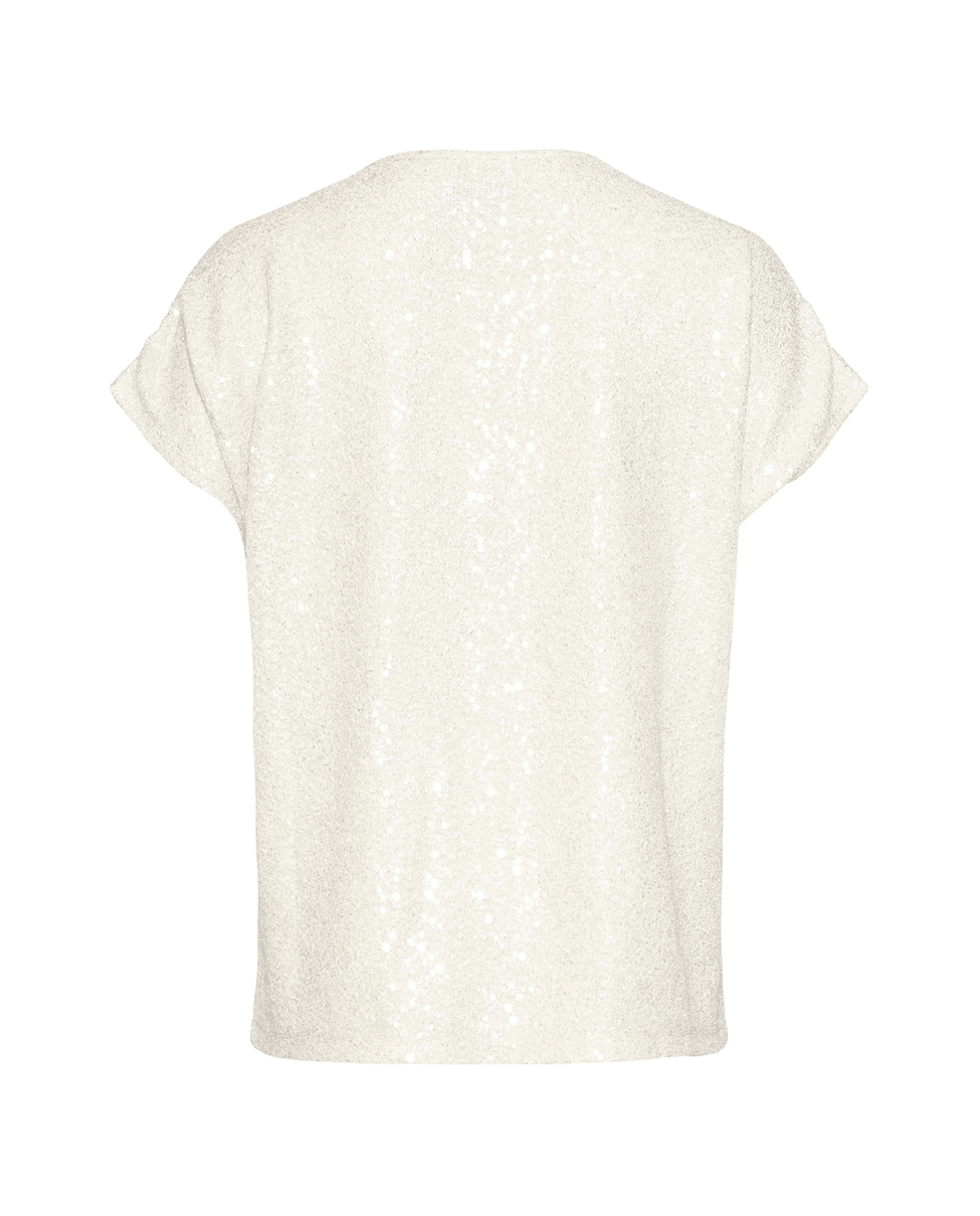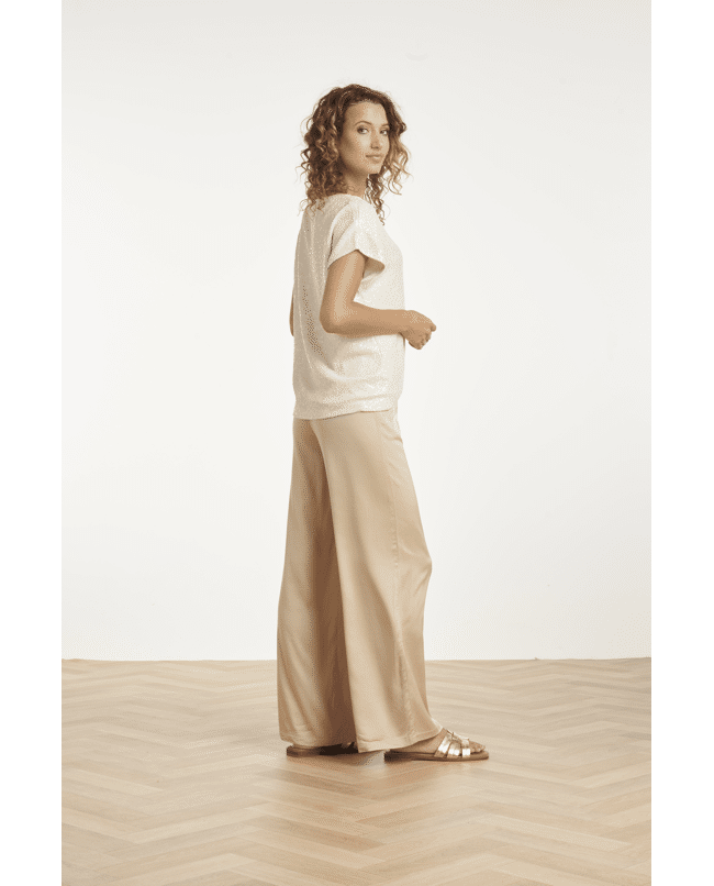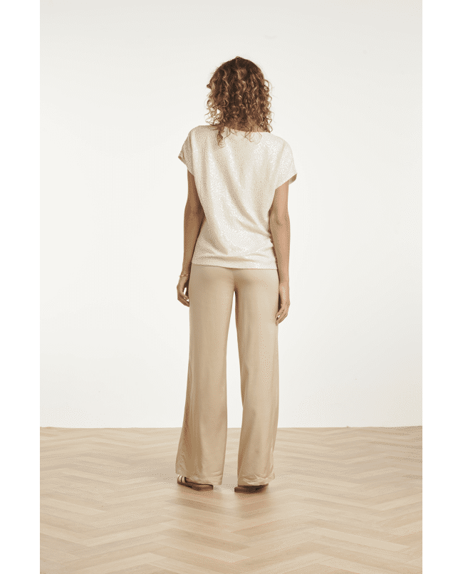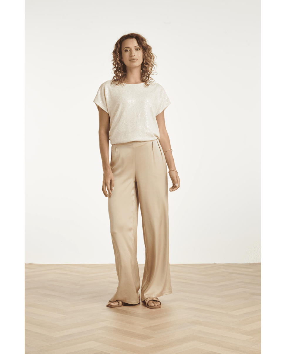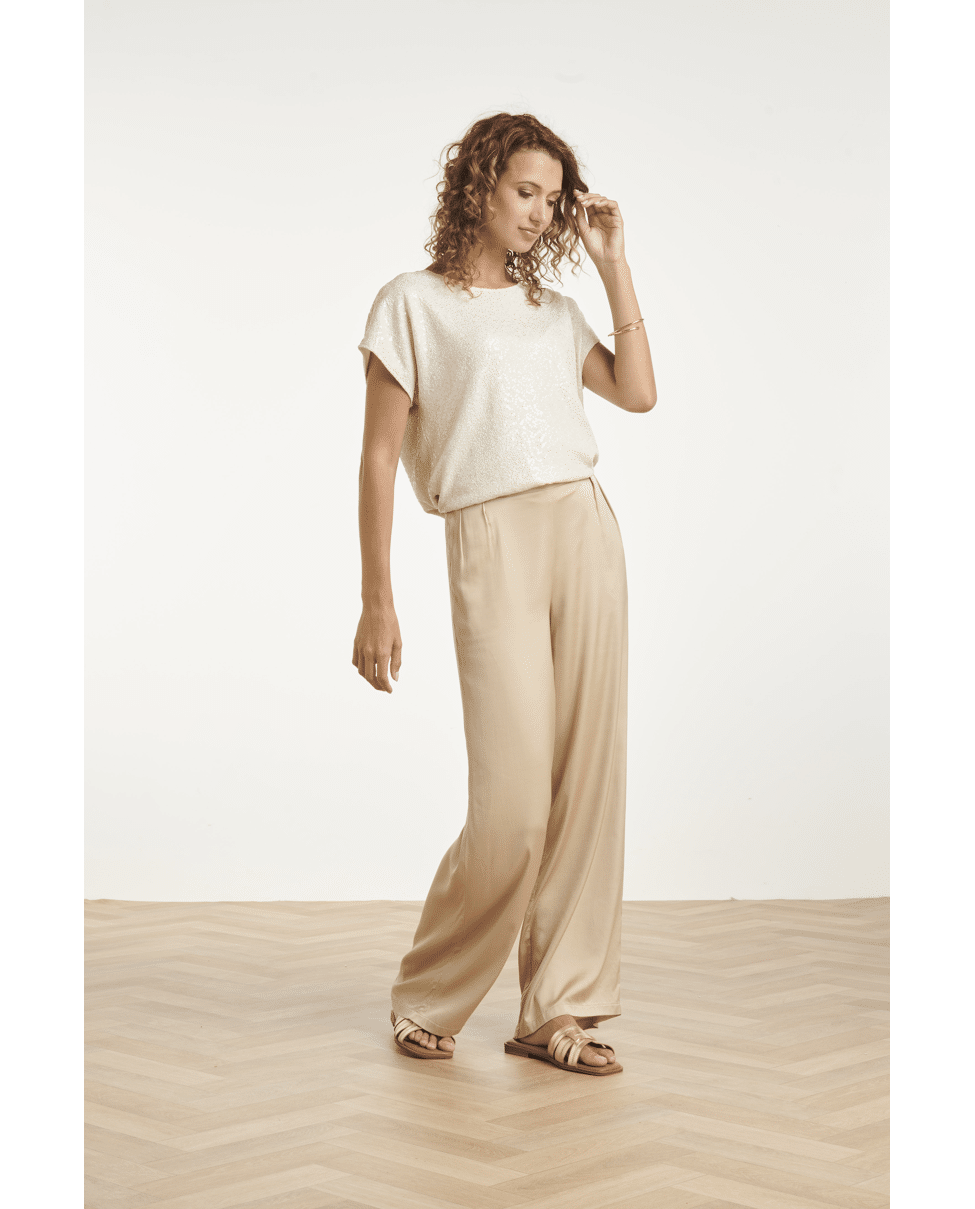 Deze champagnekleurige glitter top van Smashed Lemon geeft je outfit meteen een feestelijke touch. De subtiele shimmer en de soepele stof maken dit een ideale top voor een diner, feestje of zomerse gelegenheid. Draag ‘m chic met een satijnen pantalon of juist casual met een jeans.