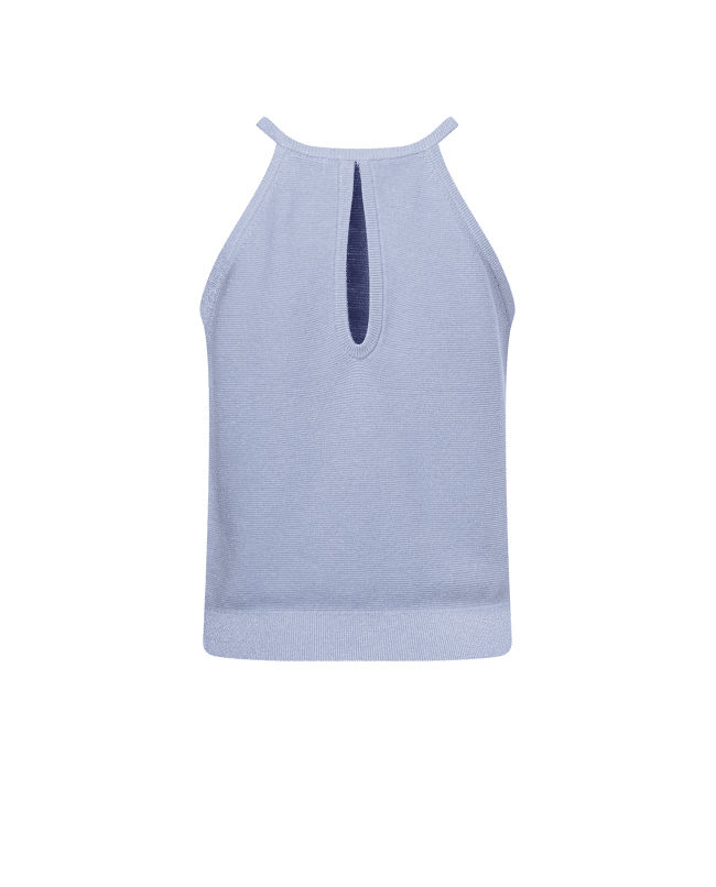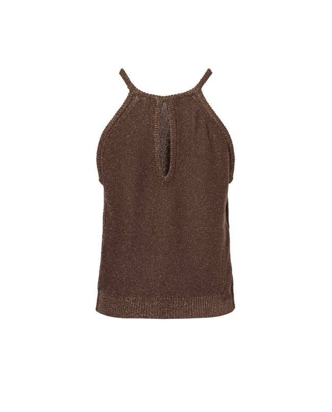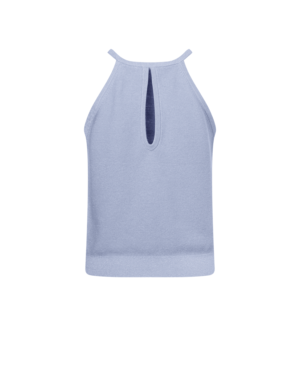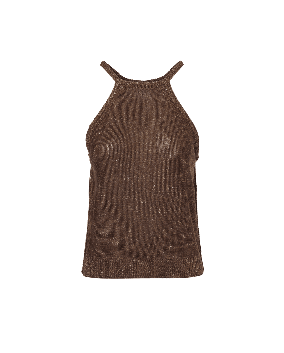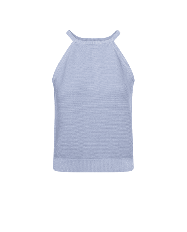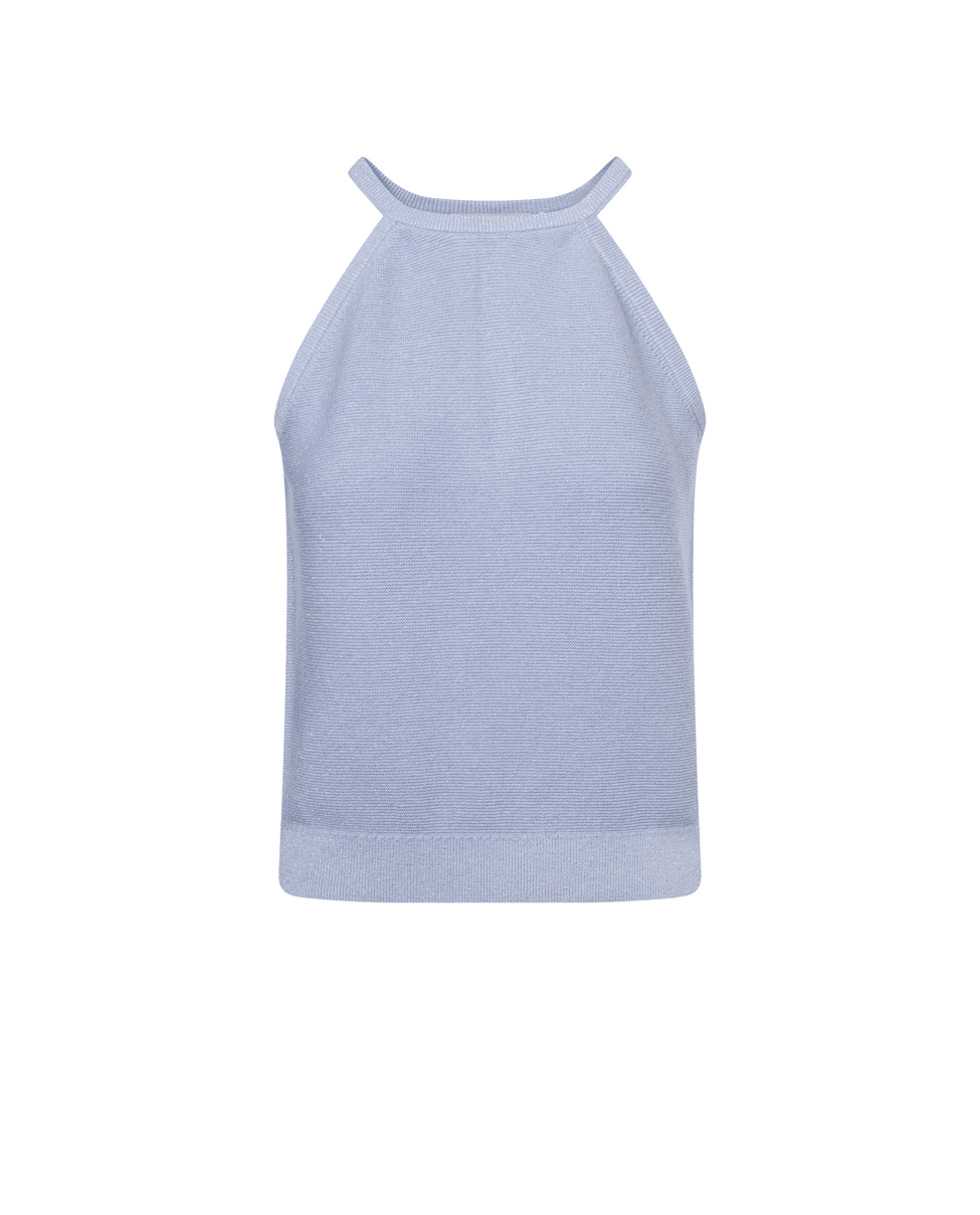 Deze zomerse knit top combineert minimalisme met een subtiele sparkle. Mooi op zichzelf of als laagje onder een blazer of open blouse.