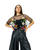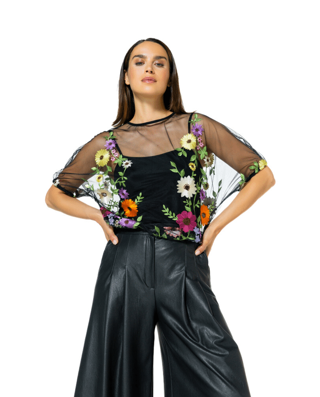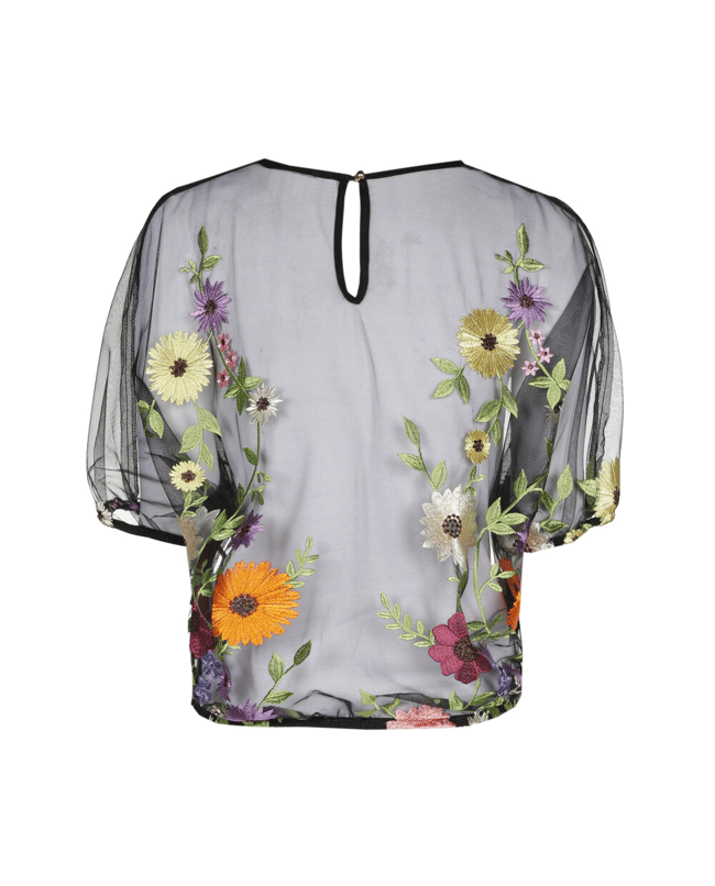 Deze luchtige mesh top met kleurrijke bloemenbroderie voegt meteen speelsheid toe aan je look. Ideaal voor lente-events of een zomerse avond uit.