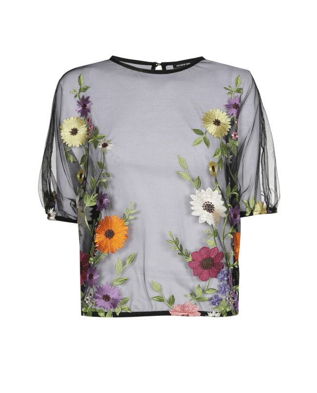 Transparante dames top van Caroline Biss met kleurrijke geborduurde bloemen, korte pofmouwen en ronde hals