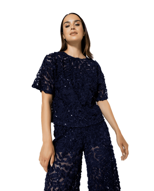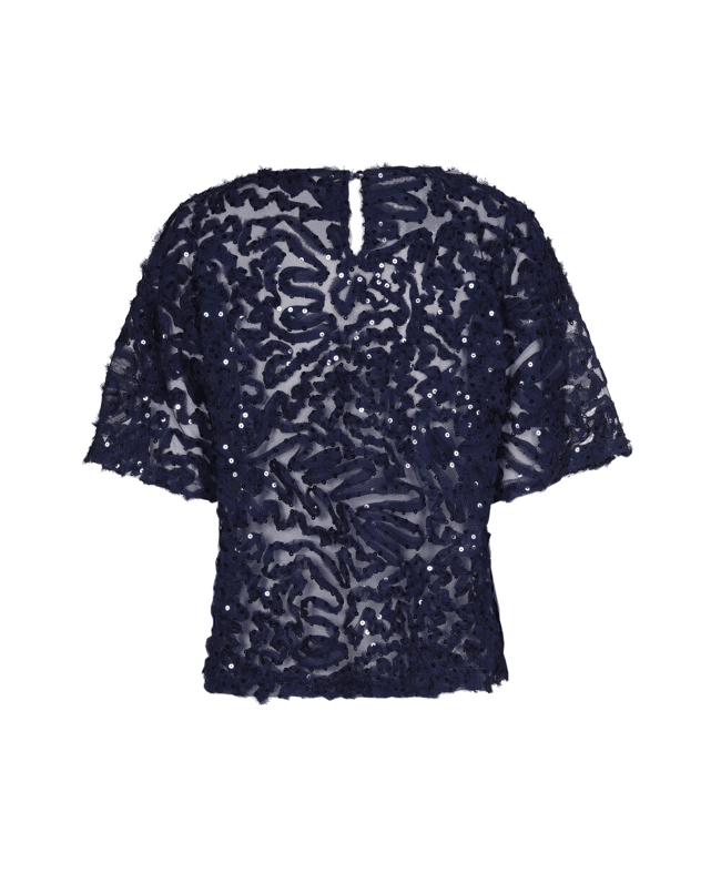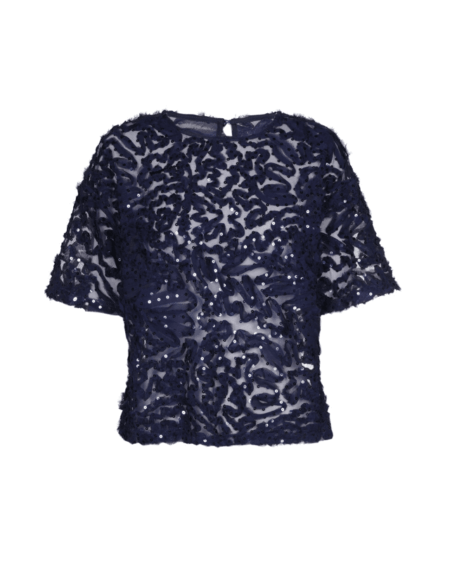 Een opvallende, transparante top met ton-sur-ton pailletten en structuur. Perfect voor feestelijke gelegenheden of als statement piece op een basic look.