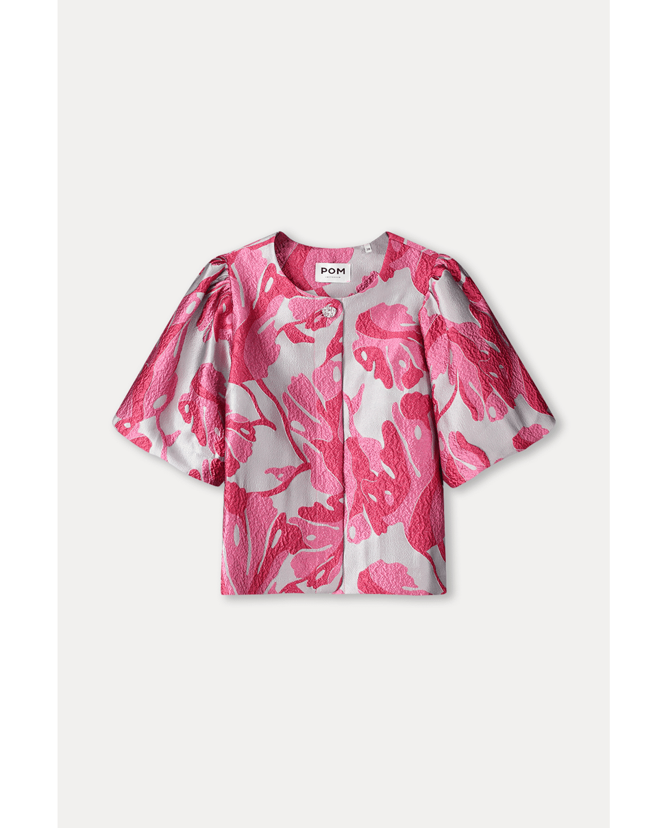 Deze jacquard top is allesbehalve basic. Met haar uitgesproken bloemenprint en glanzende textuur is ze gemaakt om op te vallen. Voor wie kleur durft en stijl waardeert.