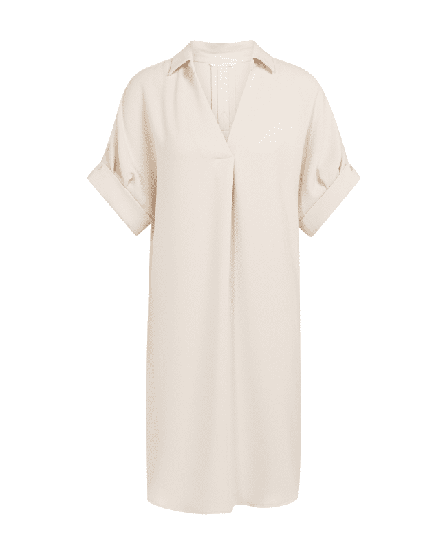 De soepele stof en subtiele plooien in de mouwen geven deze jurk net wat extra beweging en elegantie.