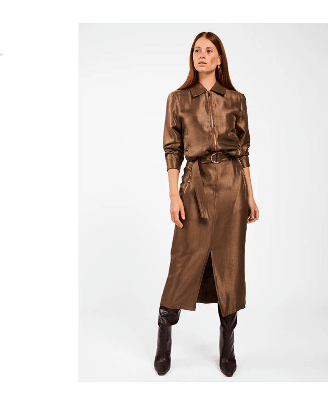 De Varyas rok van Aaiko is een elegante rok met een subtiele glans. De bijpassende ceintuur en het split aan de voorkant geven een vrouwelijke, moderne touch. Ideaal voor het najaar, van werkdag tot diner.
