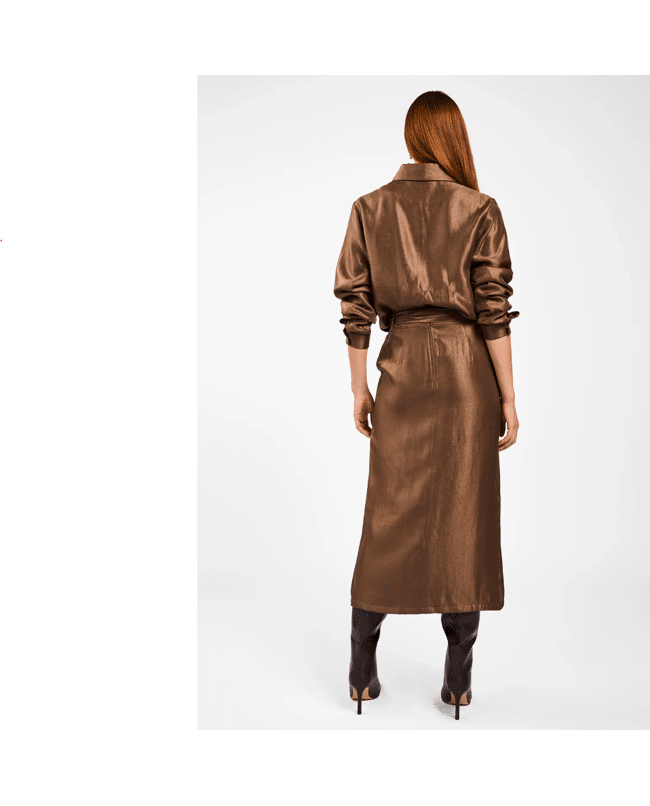 De combinatie van glanzende stof, rechte lijn en handige ritszakken maakt deze rok stijlvol én praktisch.
