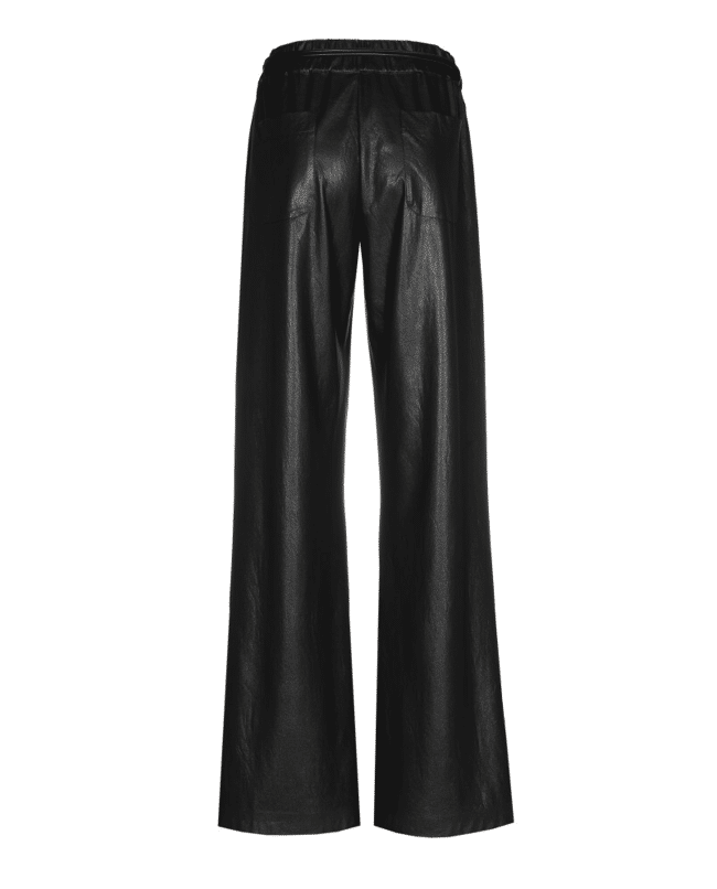 Deze wijde broek van soepel vegan leather zit heerlijk én oogt stijlvol. De elastische tailleband en sierlijke riem geven extra flair.