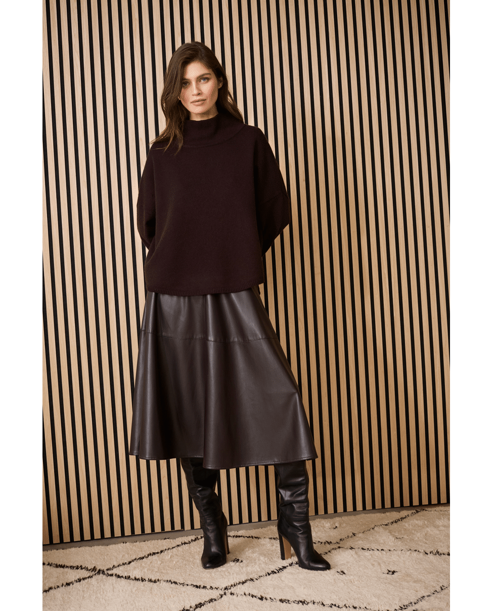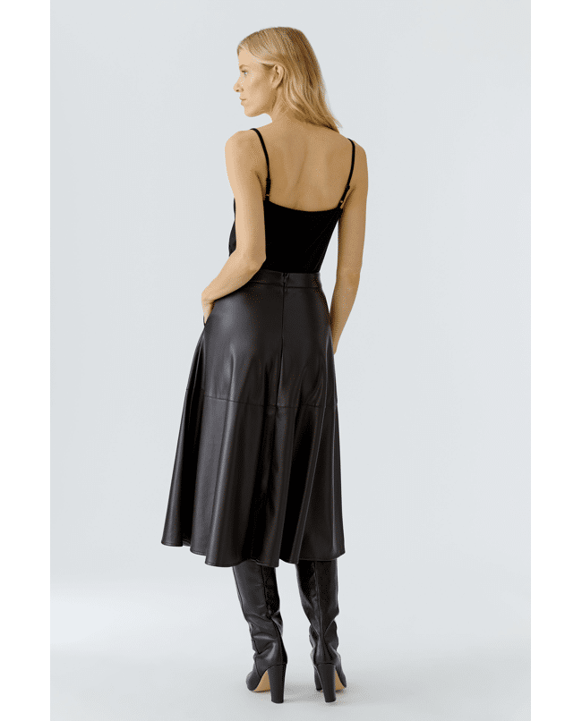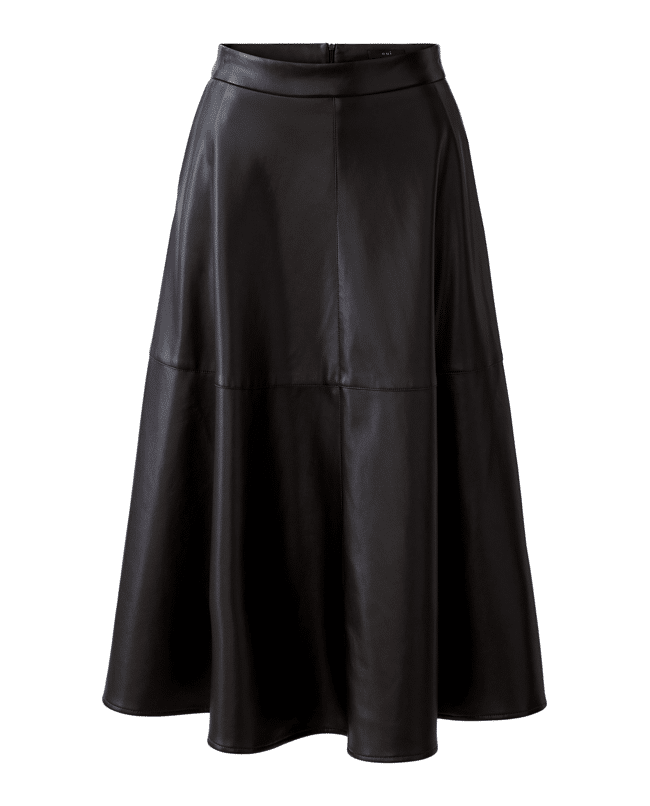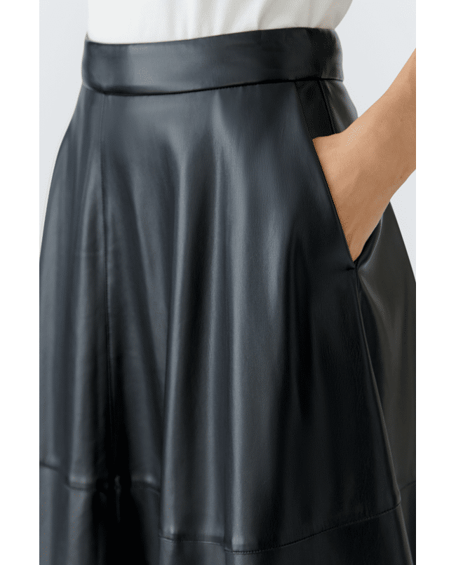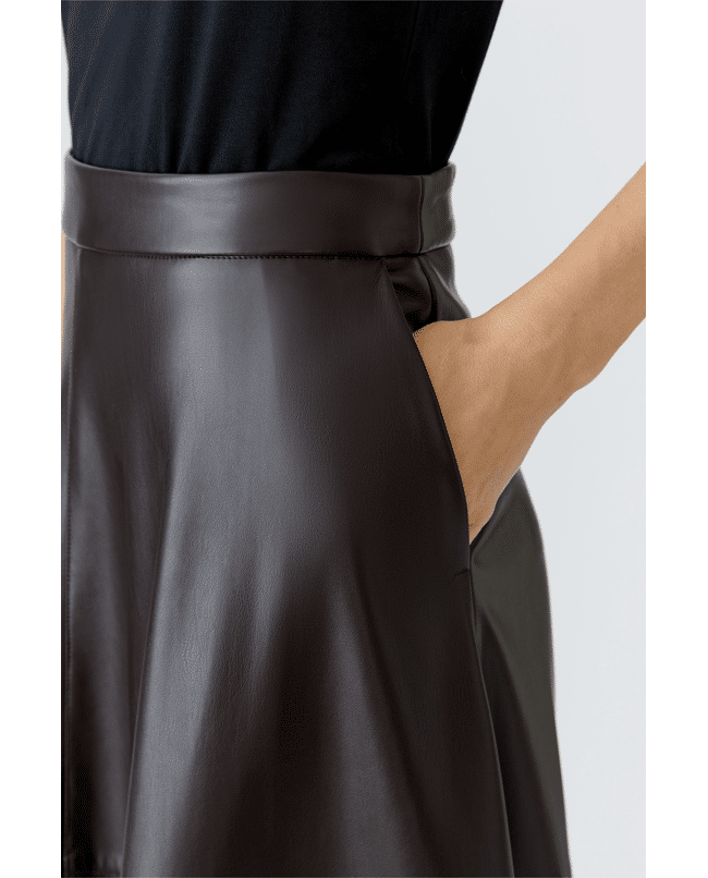 Het gebruik van vegan leer geeft de rok een moderne, bewuste twist zonder in te leveren op stijl.