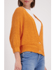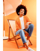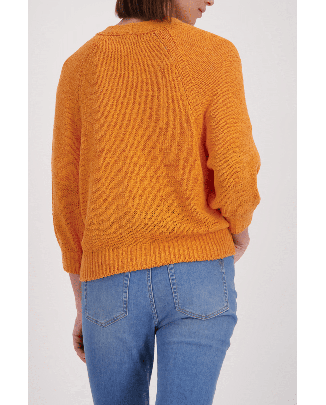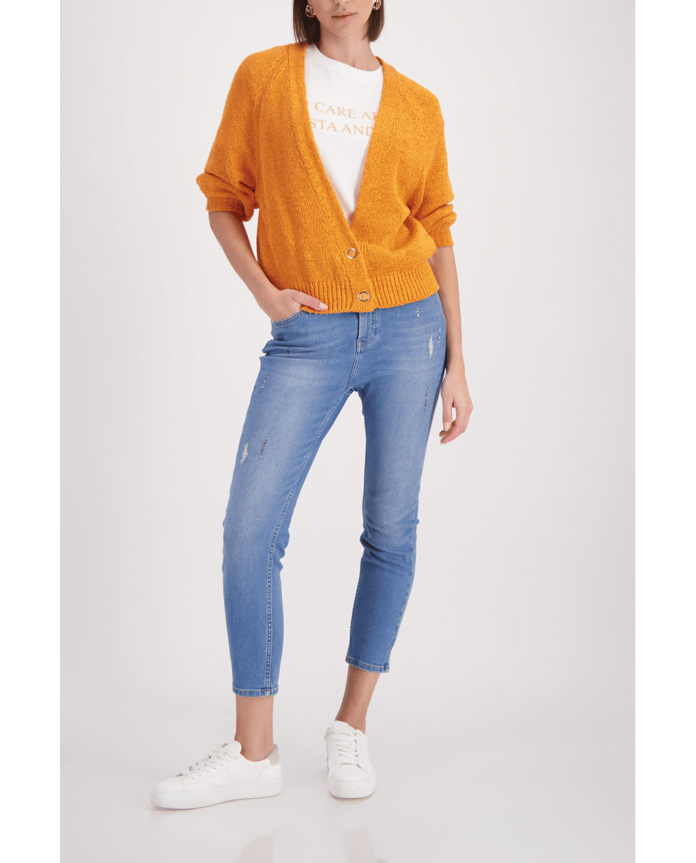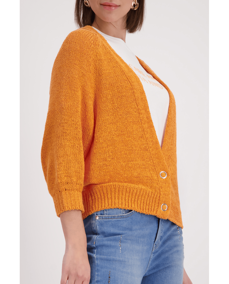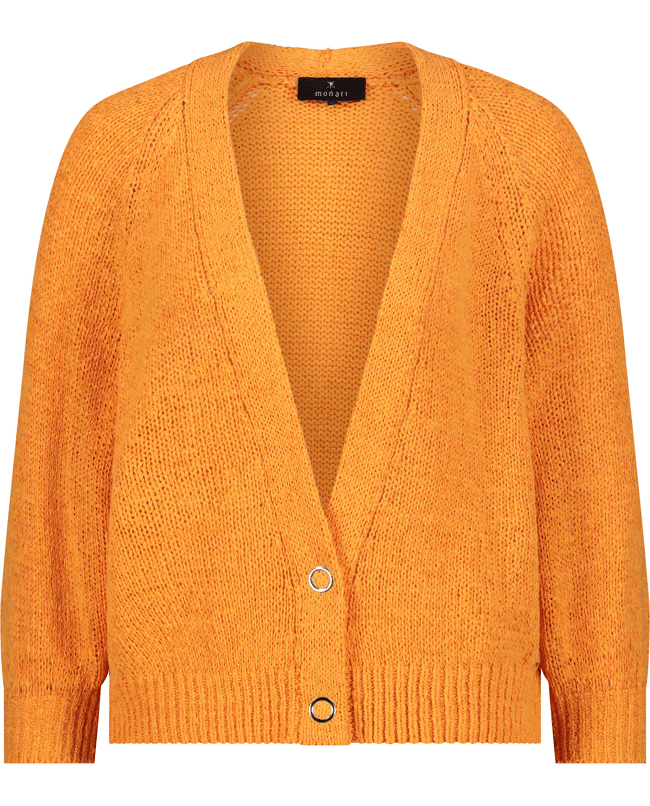 Dit gebreide vest van Monari in een warme oranje tint brengt direct kleur in je voorjaarsgarderobe. Het korte model met V-hals en subtiele drukknoopjes maakt het een veelzijdig item voor frisse dagen.
