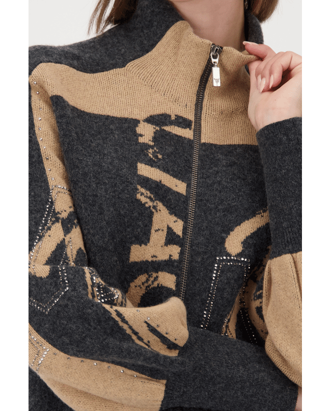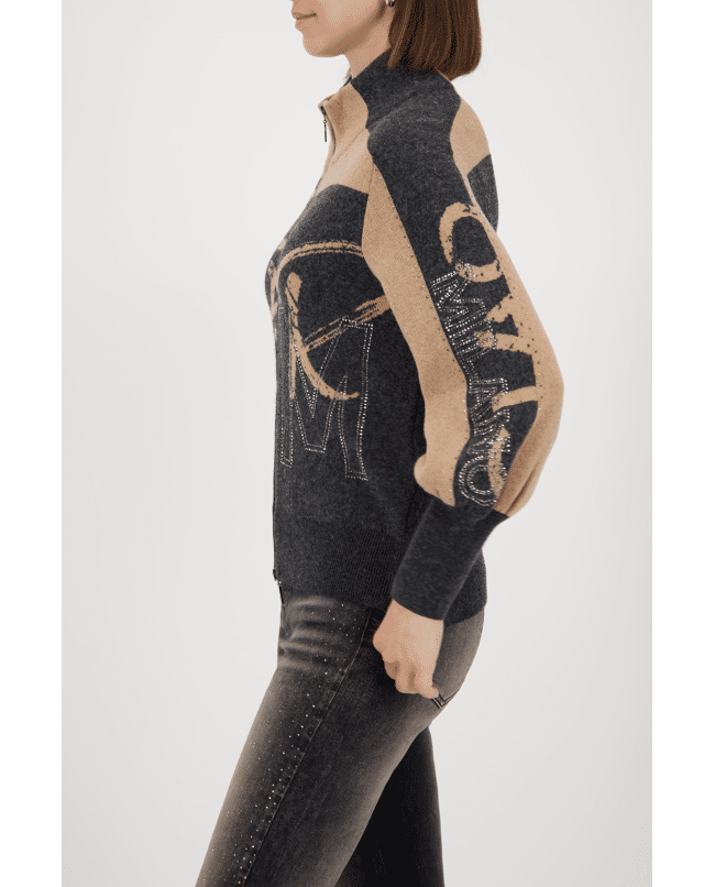 Dit opvallende vest van Monari combineert comfort met karakter. De mix van beige en grijs, grafische letters en strass-details geven dit item een eigentijdse flair.