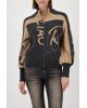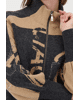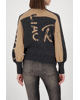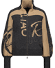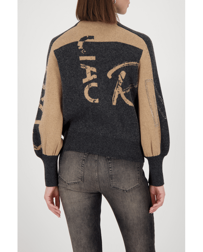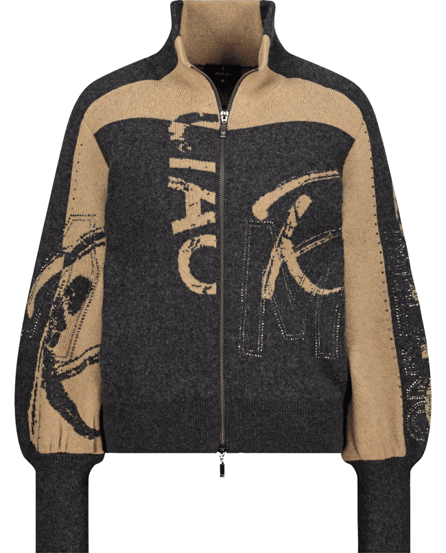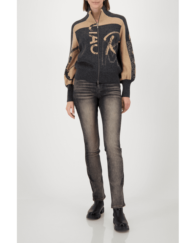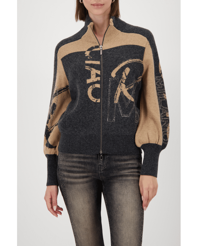 Damesvest van Monari met grafische letters en strass-details, opstaande kraag, ritssluiting en lange ballonmouwen