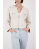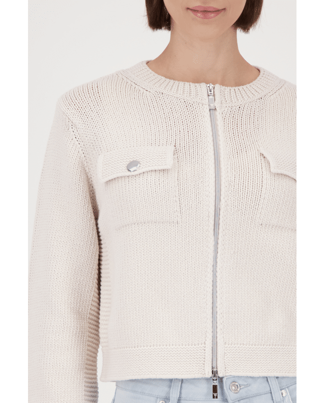 •Zilverkleurige ritssluiting en klepzakken met knoop