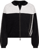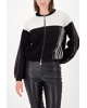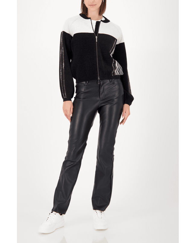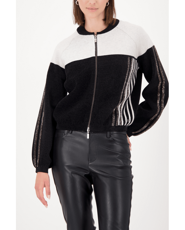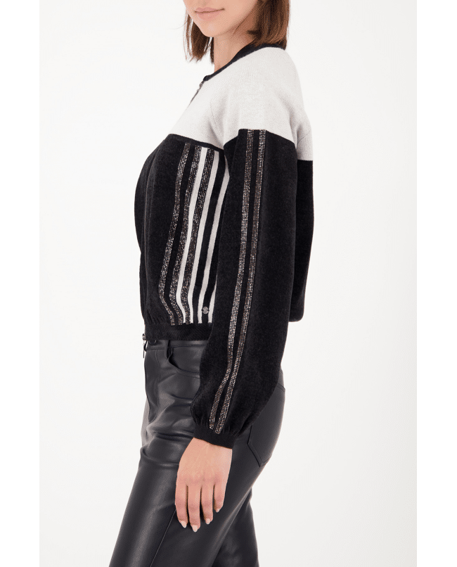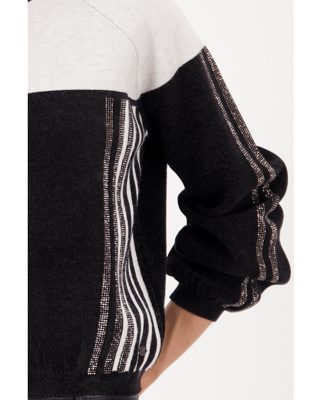 De strass-details geven het vest een subtiele sparkle. De mix van structuren en kleuren zorgt voor een dynamische, moderne look.