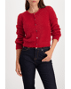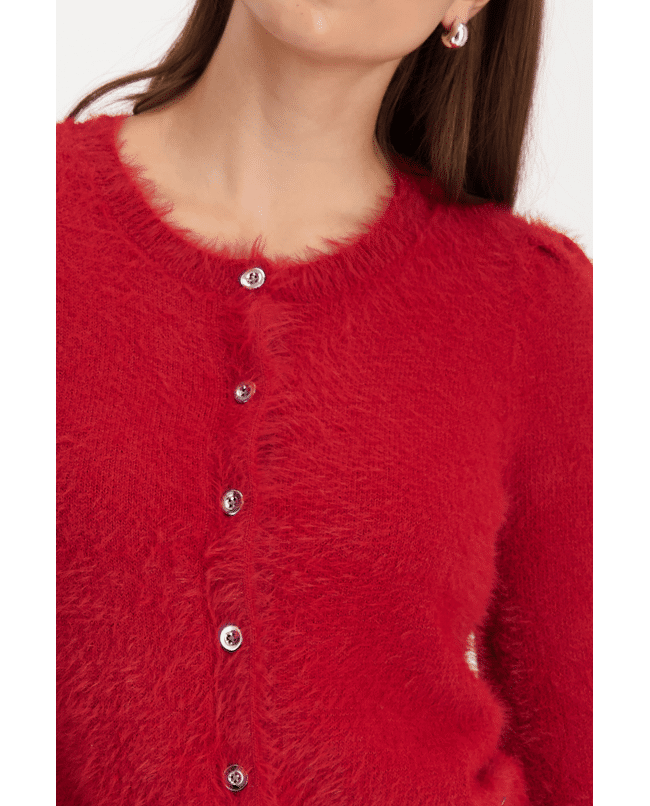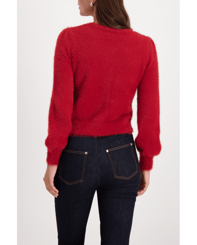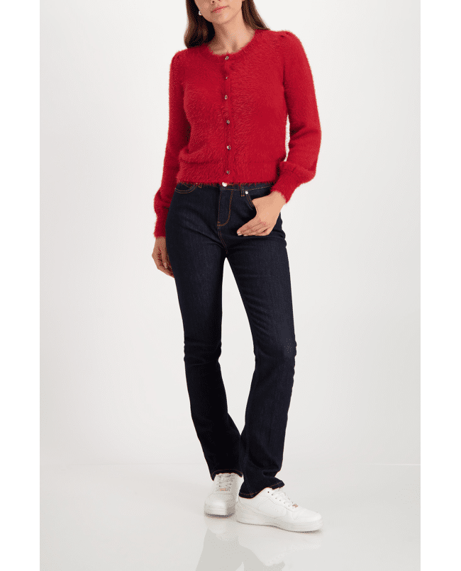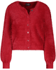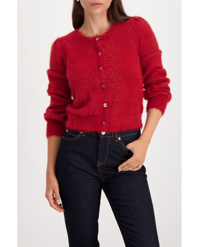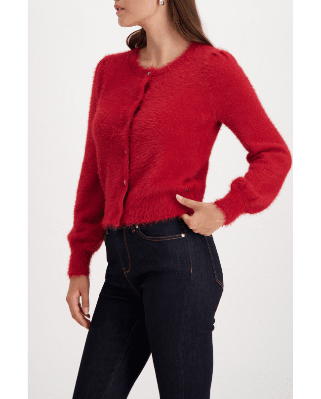 Damesvest van Monari met zachte fluffy textuur, knoopsluiting, ronde hals en lange mouwen