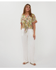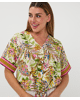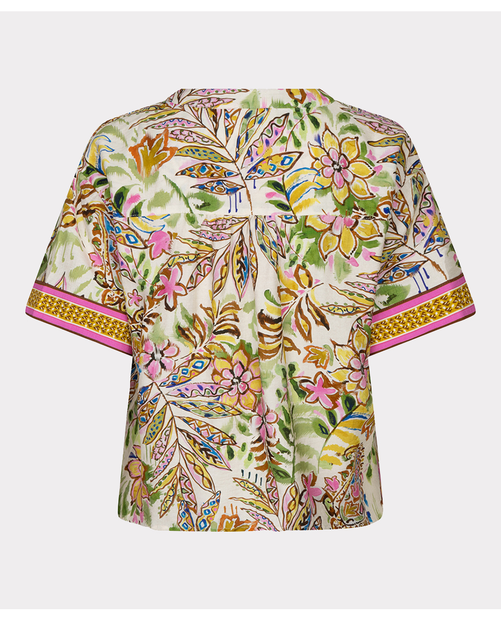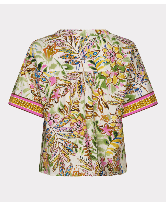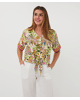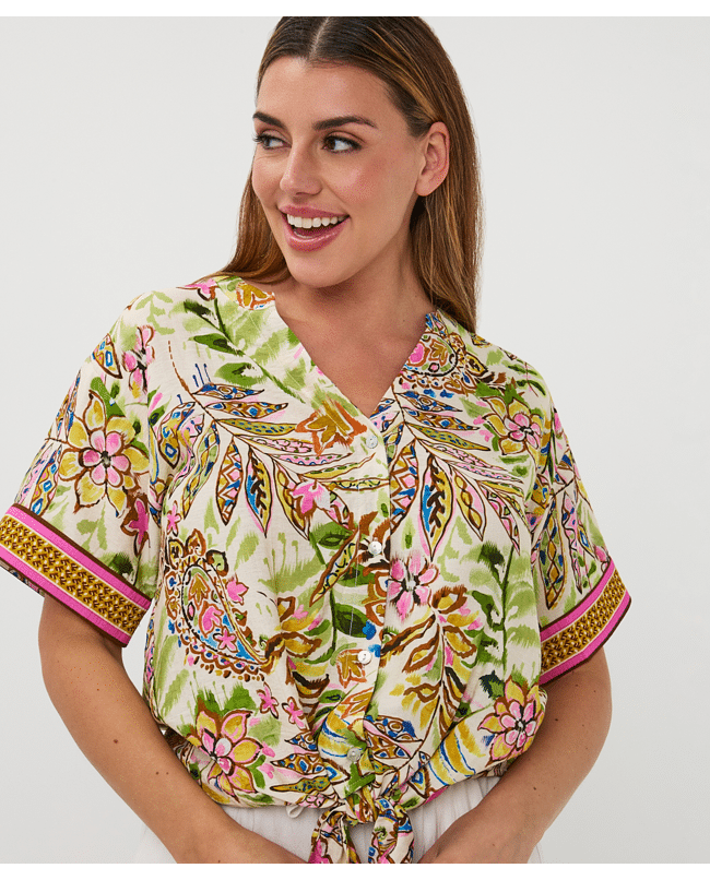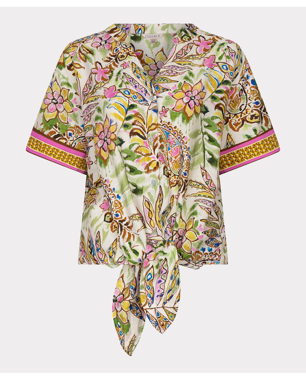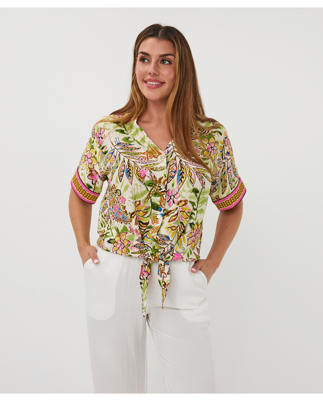 Deze kleurrijke blouse met jungle paisleyprint is zomers, luchtig en speels dankzij de knoop aan de voorkant. De V-hals en korte mouwen maken het een perfecte keuze voor warme dagen.