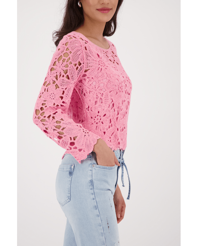 Het verfijnde haakwerk met grote bloemmotieven maakt deze trui opvallend en elegant tegelijk. Een statement piece dat toch zacht oogt.