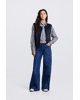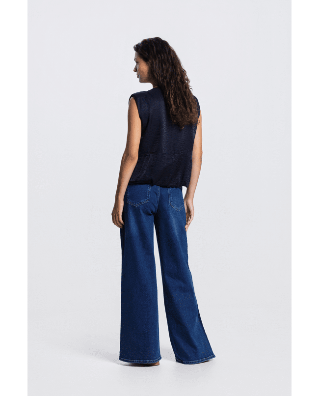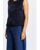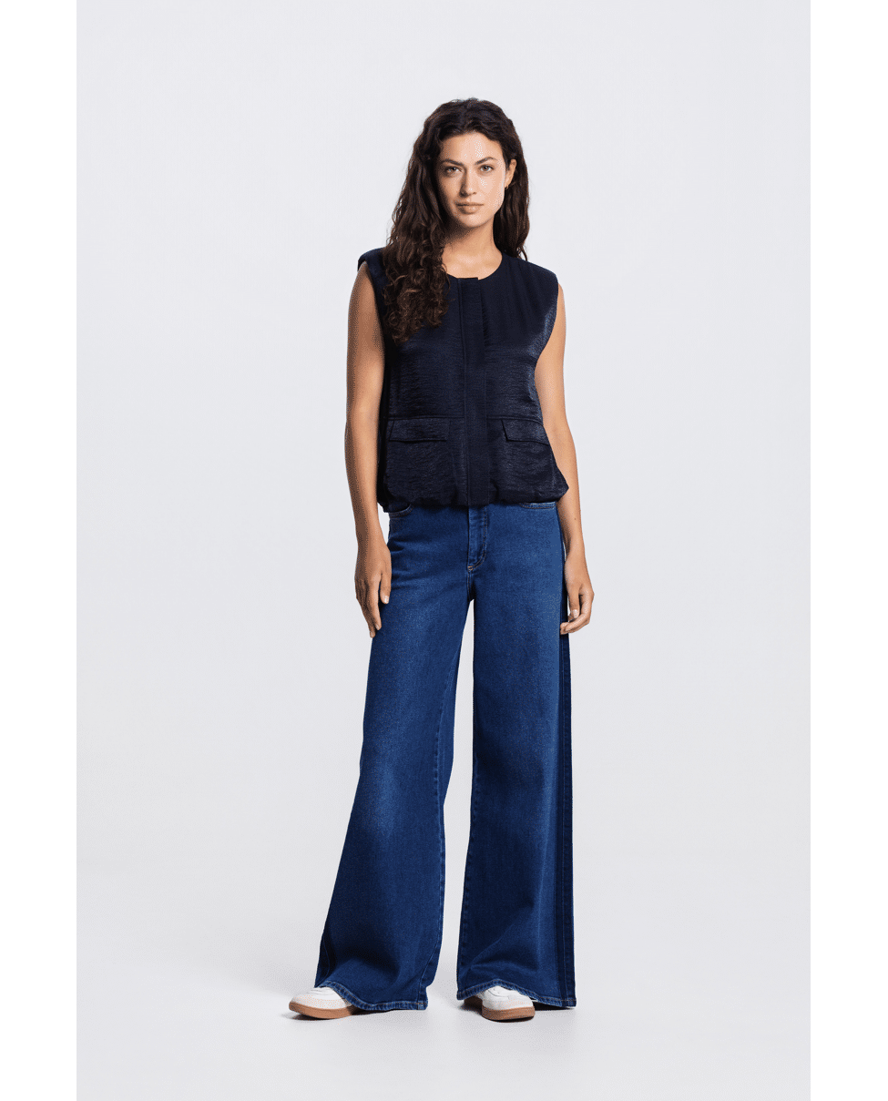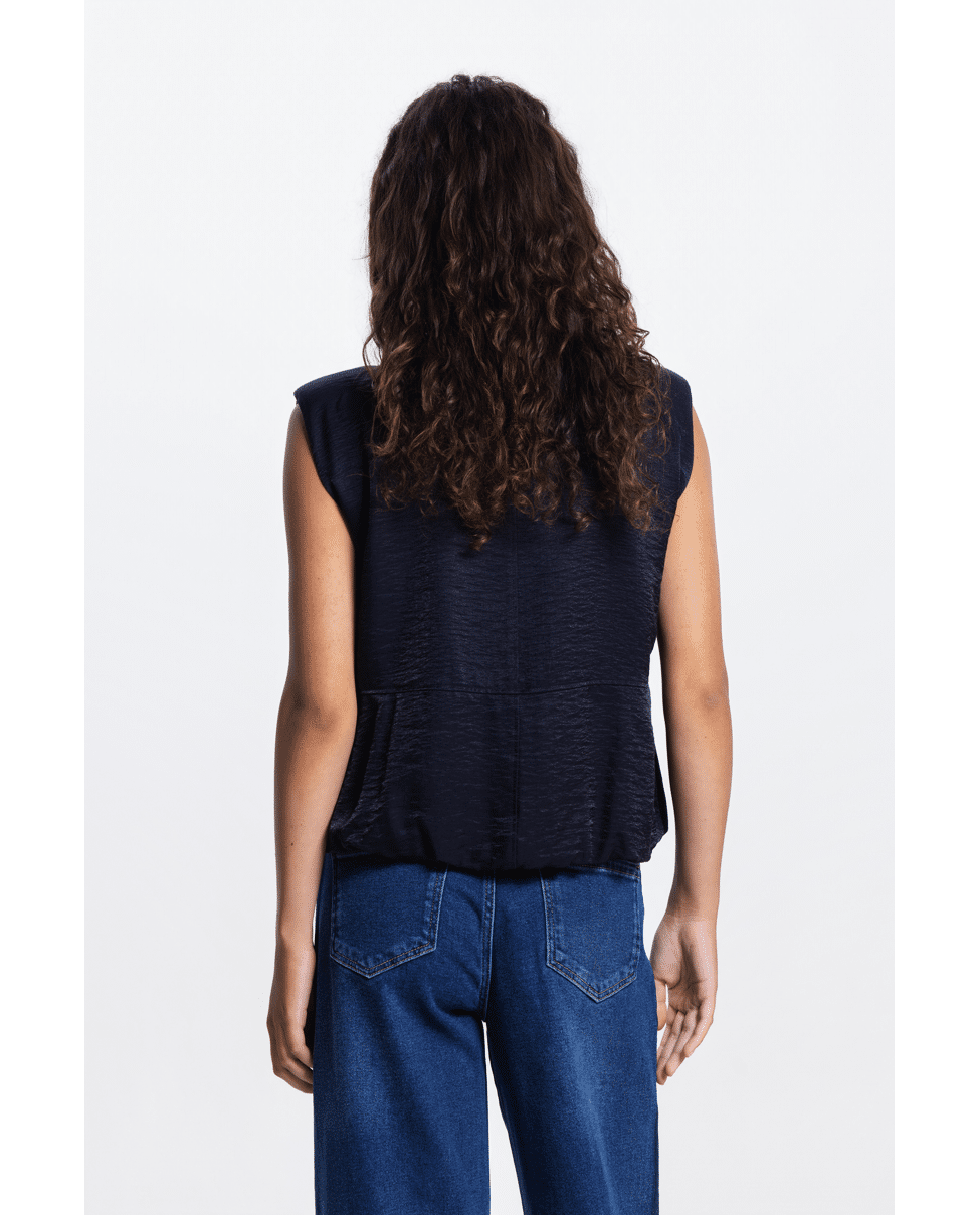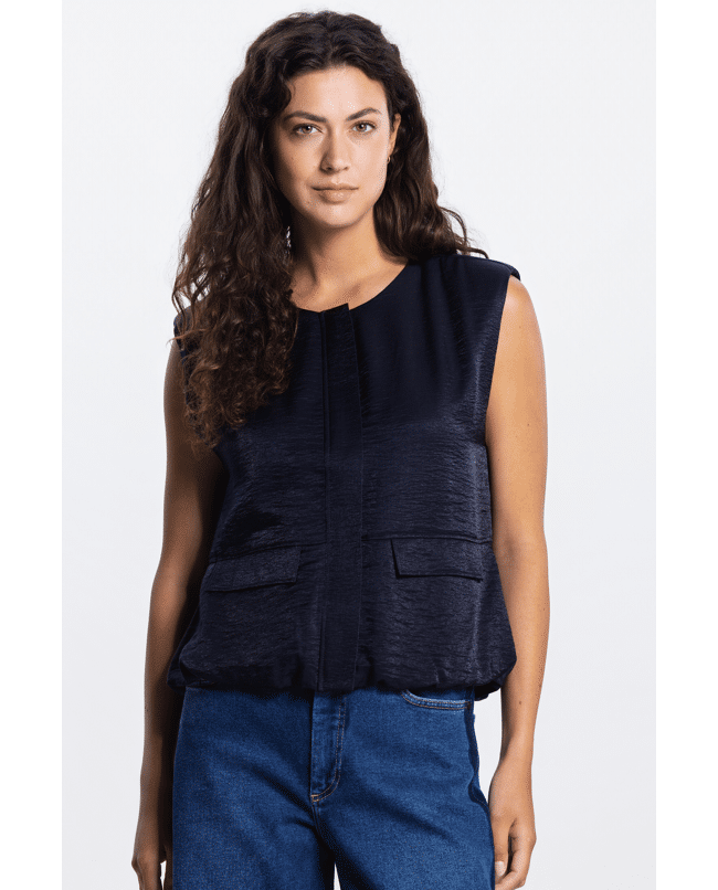 Dit mouwloze jasje combineert de nonchalante look van een bomber met een vrouwelijke, glanzende finish. Ideaal voor laagjes in de lente of als opvallend bovenstuk op een zomerse dag.