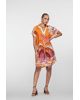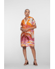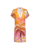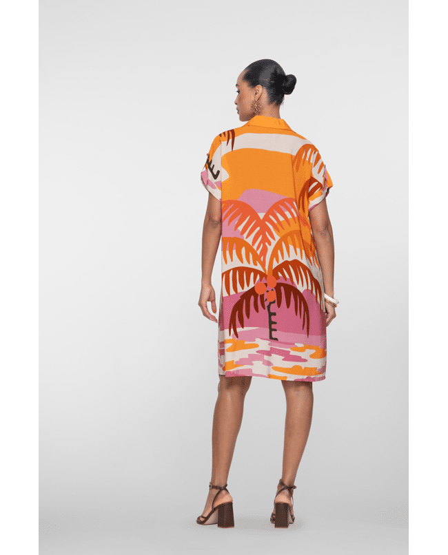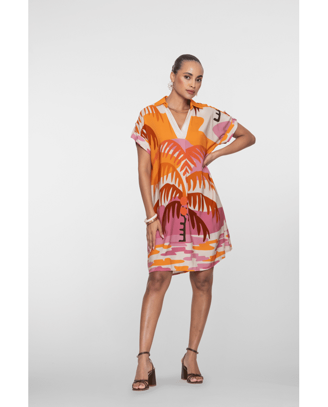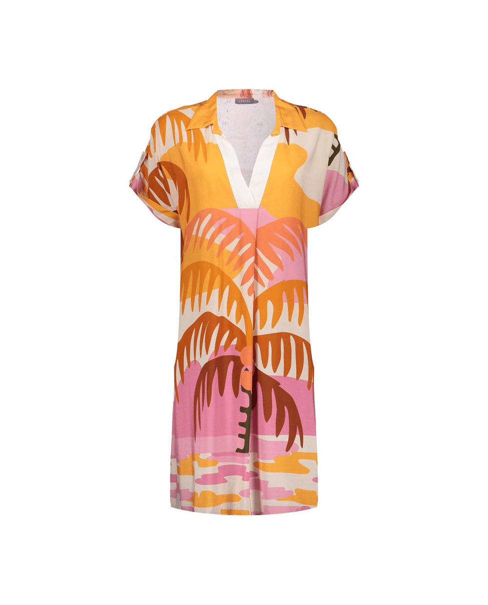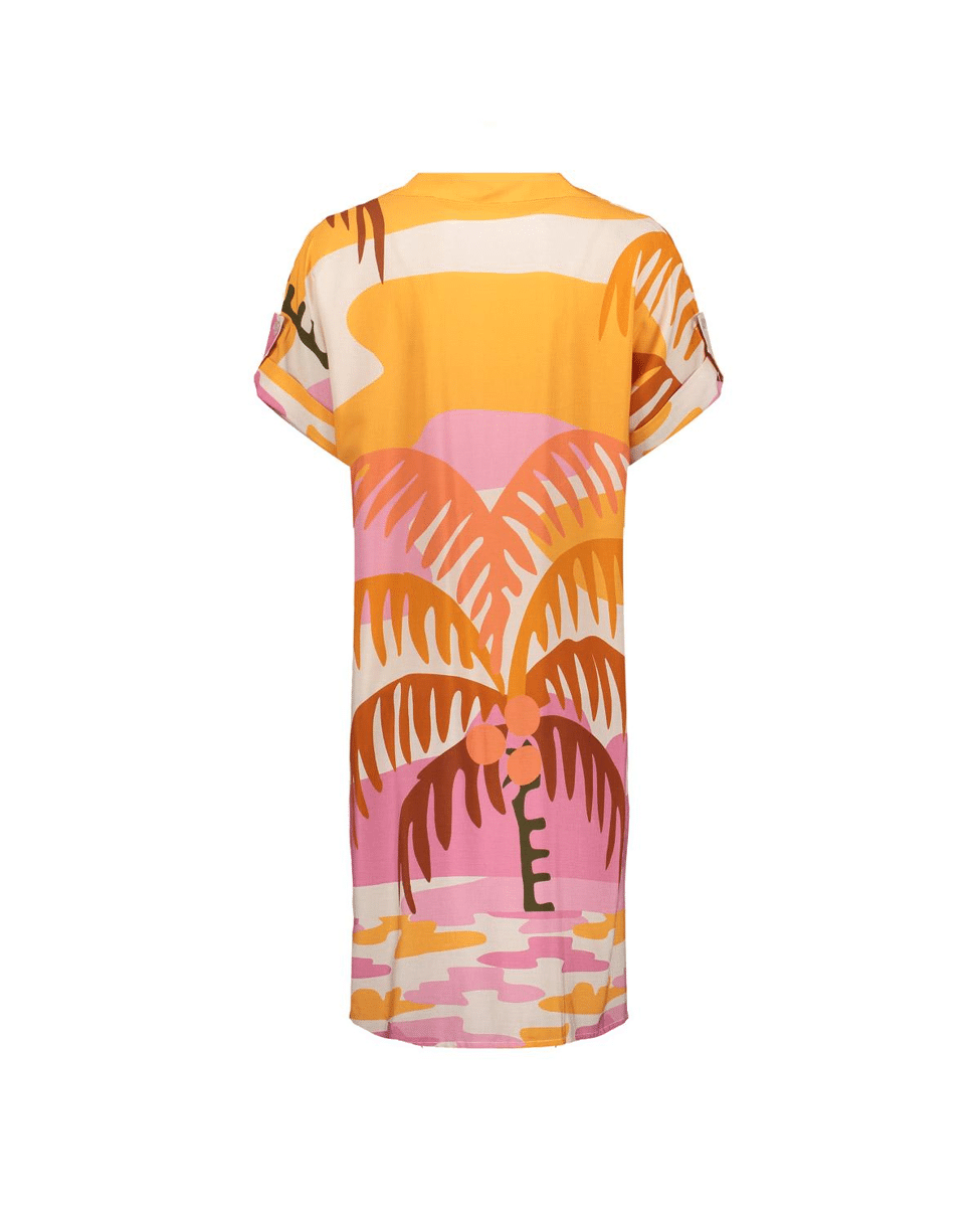 Deze roze/coral jurk met palmtree print brengt direct zomerse energie in je garderobe. De luchtige viscose en het rechte model maken haar ideaal voor warme dagen, vakantie of een etentje op een zwoele avond.