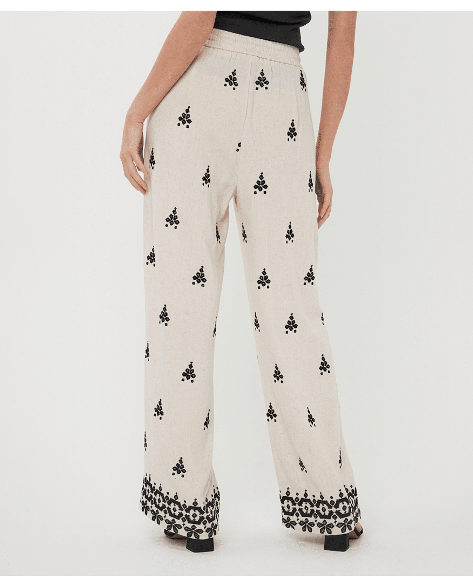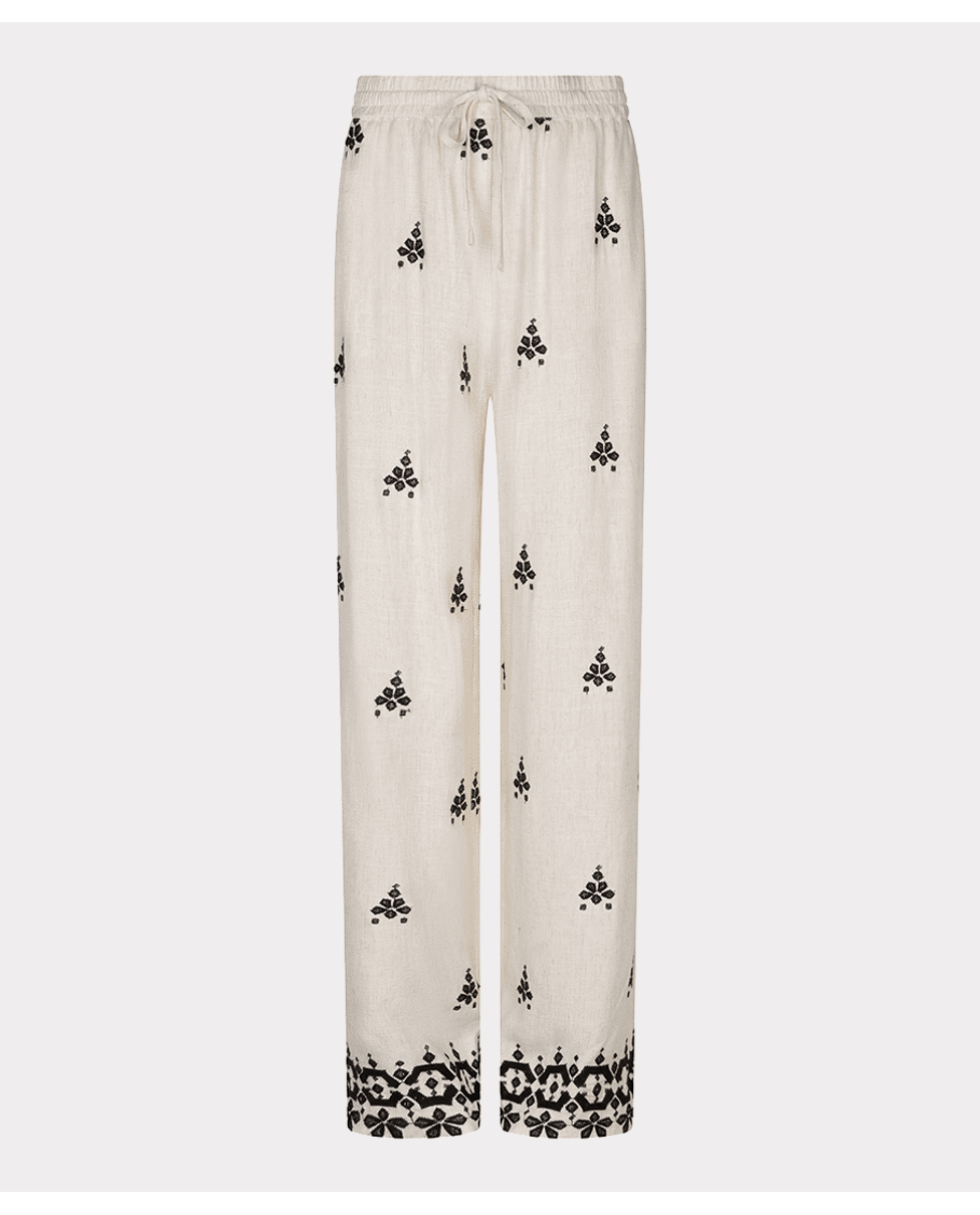 Deze luchtige broek in natuurlijke tint is gemaakt van een zachte viscose-linnenmix en heeft fijne borduursels langs de pijpen. De wijde fit en elastische tailleband maken ‘m ideaal voor relaxte, zomerse dagen.