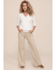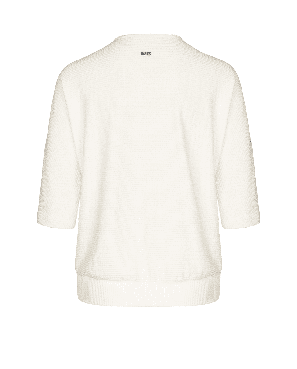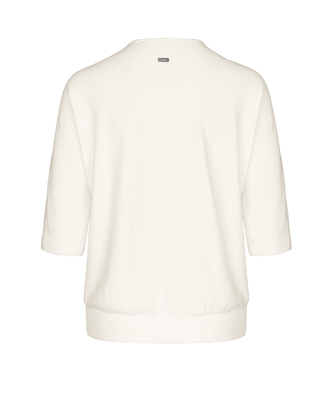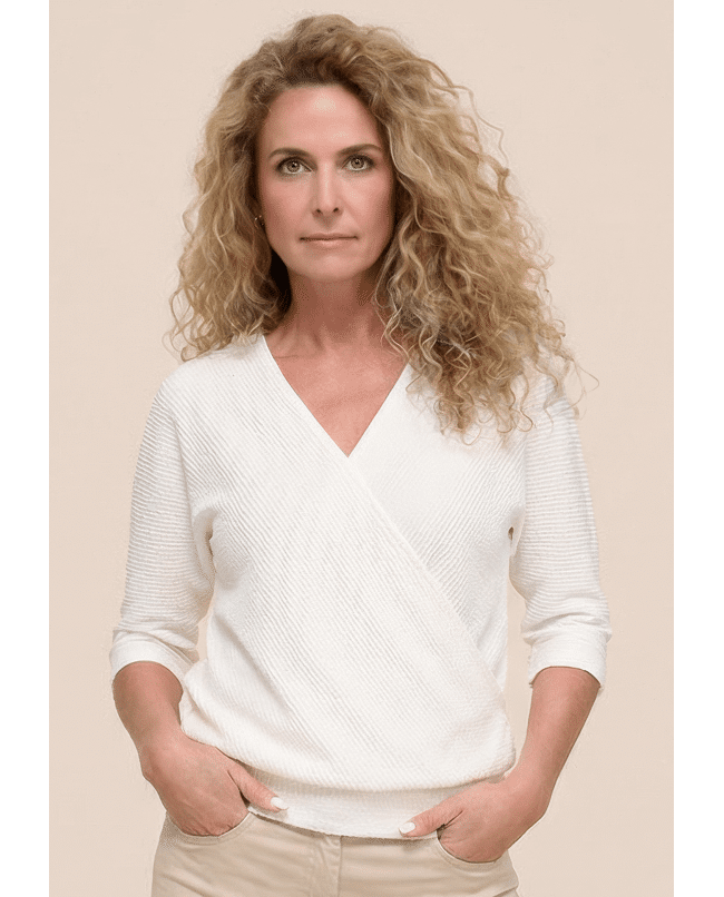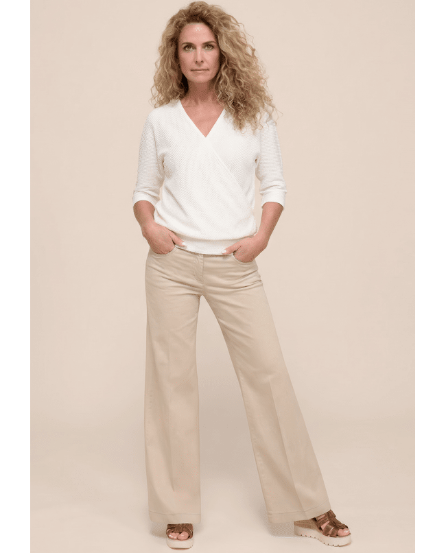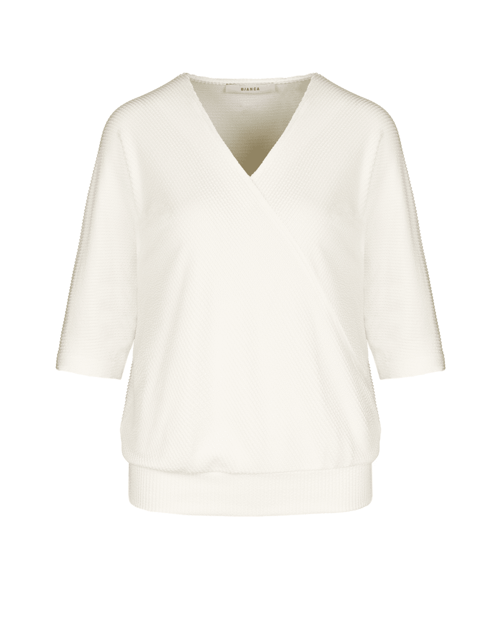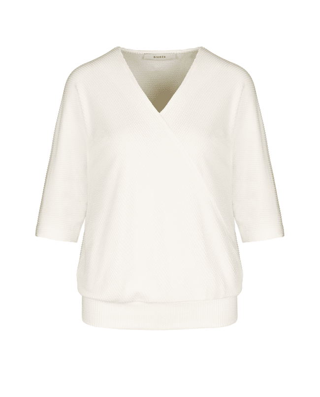 Een vrouwelijke basic met een twist: dit ecru T-shirt van Bianca is ideaal voor het voorjaar en de zomer. De subtiele structuur en overslaghals geven een speelse, maar stijlvolle uitstraling. Perfect voor werk, vrije tijd of een etentje op het terras.