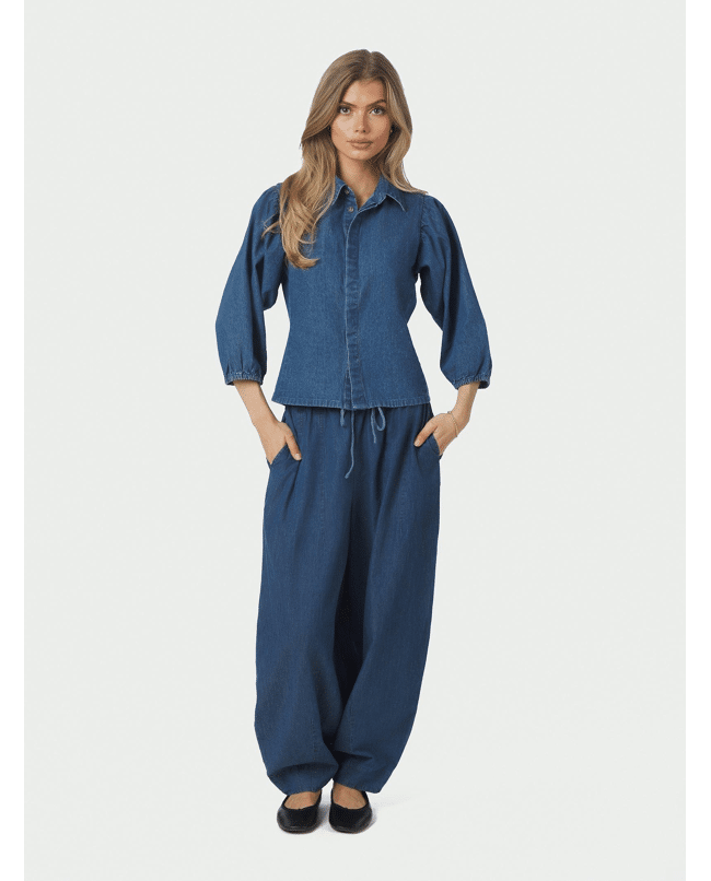 De verborgen knoopsluiting zorgt voor een rustige, cleane look, terwijl de 3/4 mouwen met elastiek een speels silhouet creëren. Denim, maar dan verfijnd en eigentijds.