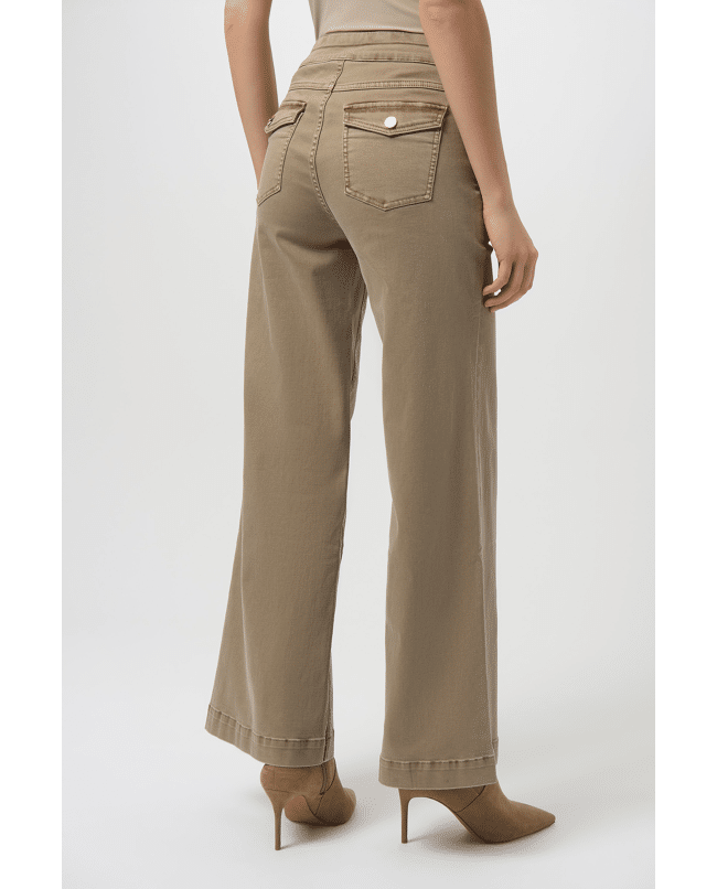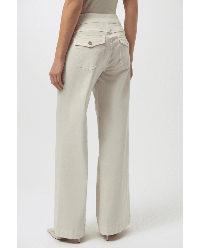 Een stijlvolle jeanslook met het comfort van een pantalon. Deze lange broek met middelhoge taille en wijde pijpen past perfect in een zakelijke én casual garderobe.