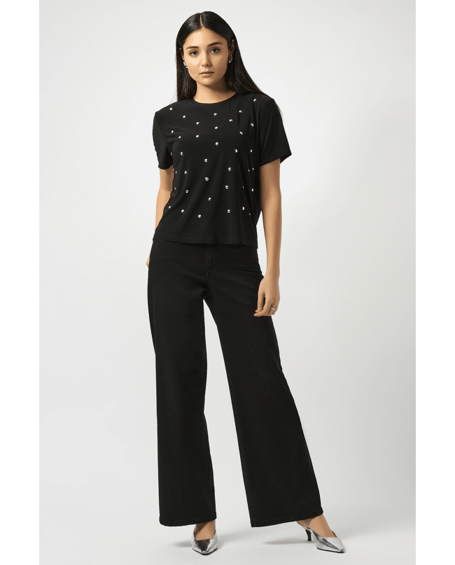 De brede pijpen geven de jeans een modieuze, eigentijdse uitstraling. Het zwarte denim maakt hem makkelijk te combineren – van casual tot chic.