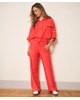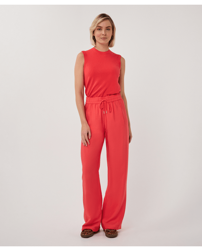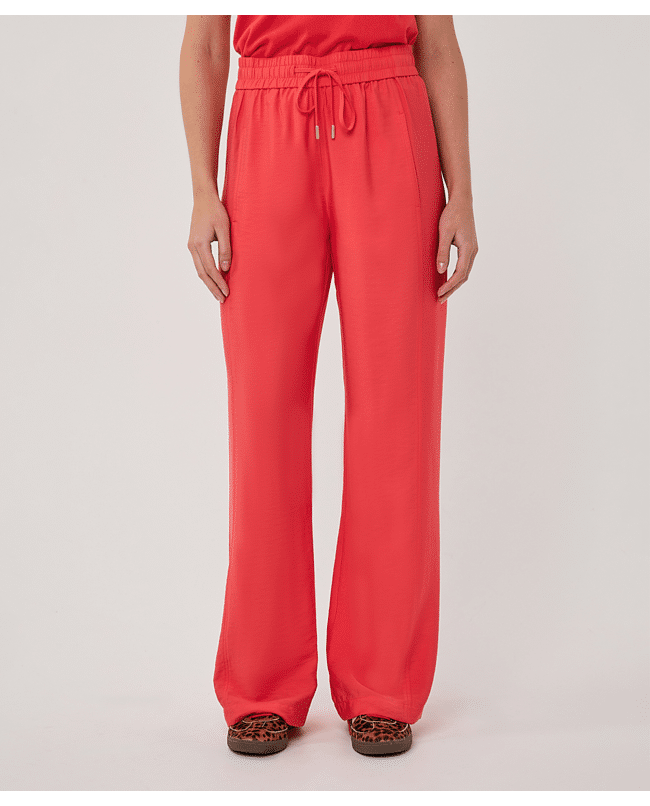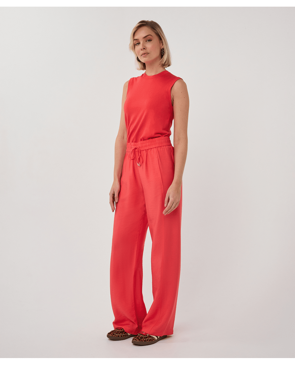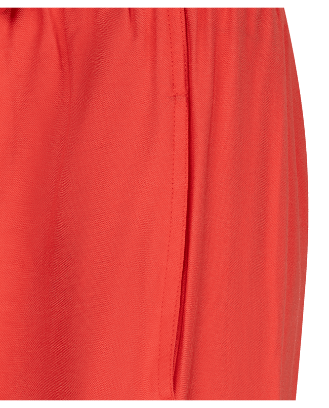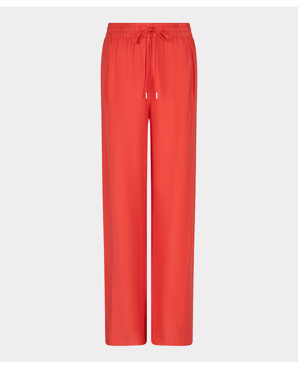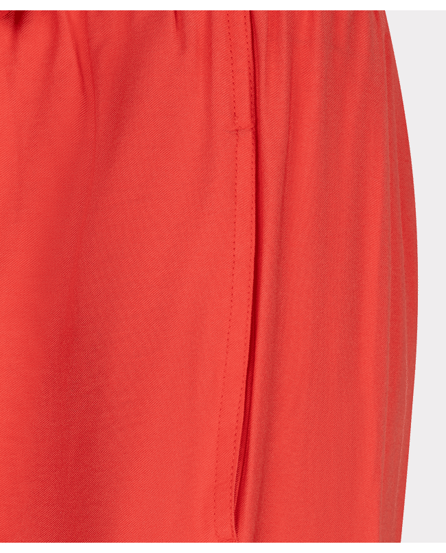 Luchtige wide leg broek in een slubstructuur met elastische tailleband. De soepele Tencel-blend en levendige kleur Chili Red maken deze broek een ideale keuze voor een stijlvolle, relaxte voorjaarslook.