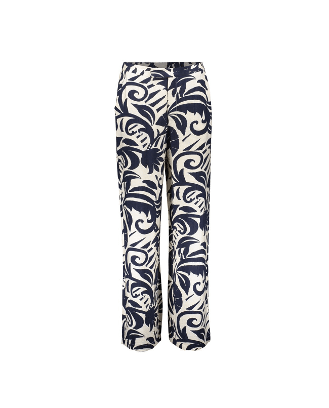 De speelse print in navy en off-white geeft meteen een frisse, artistieke uitstraling – combineer met een effen top voor balans.
