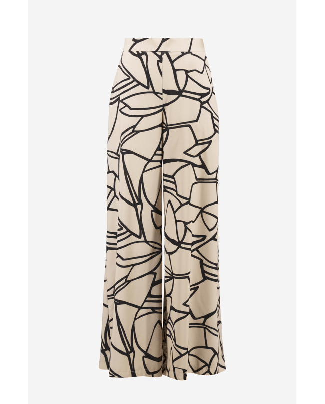 Luchtige, wijde broek met abstracte print, gemaakt van gerecycled geweven materiaal. De platte tailleband en elastische achterzijde zorgen voor een elegante look met maximaal draagcomfort – ideaal voor een relaxte maar verzorgde outfit.