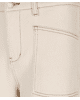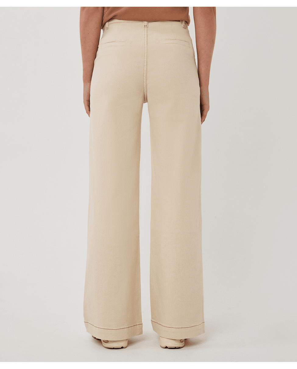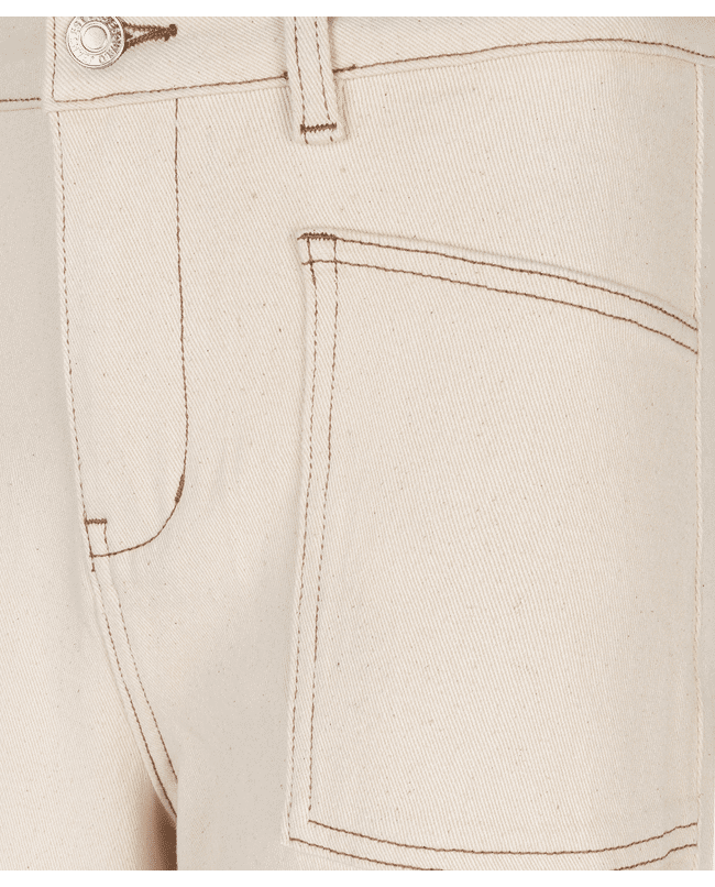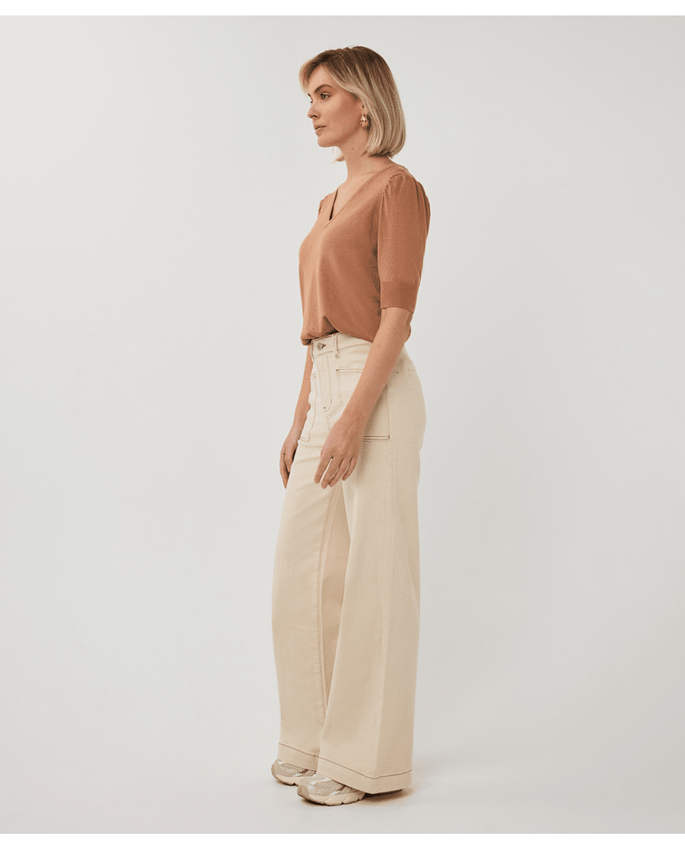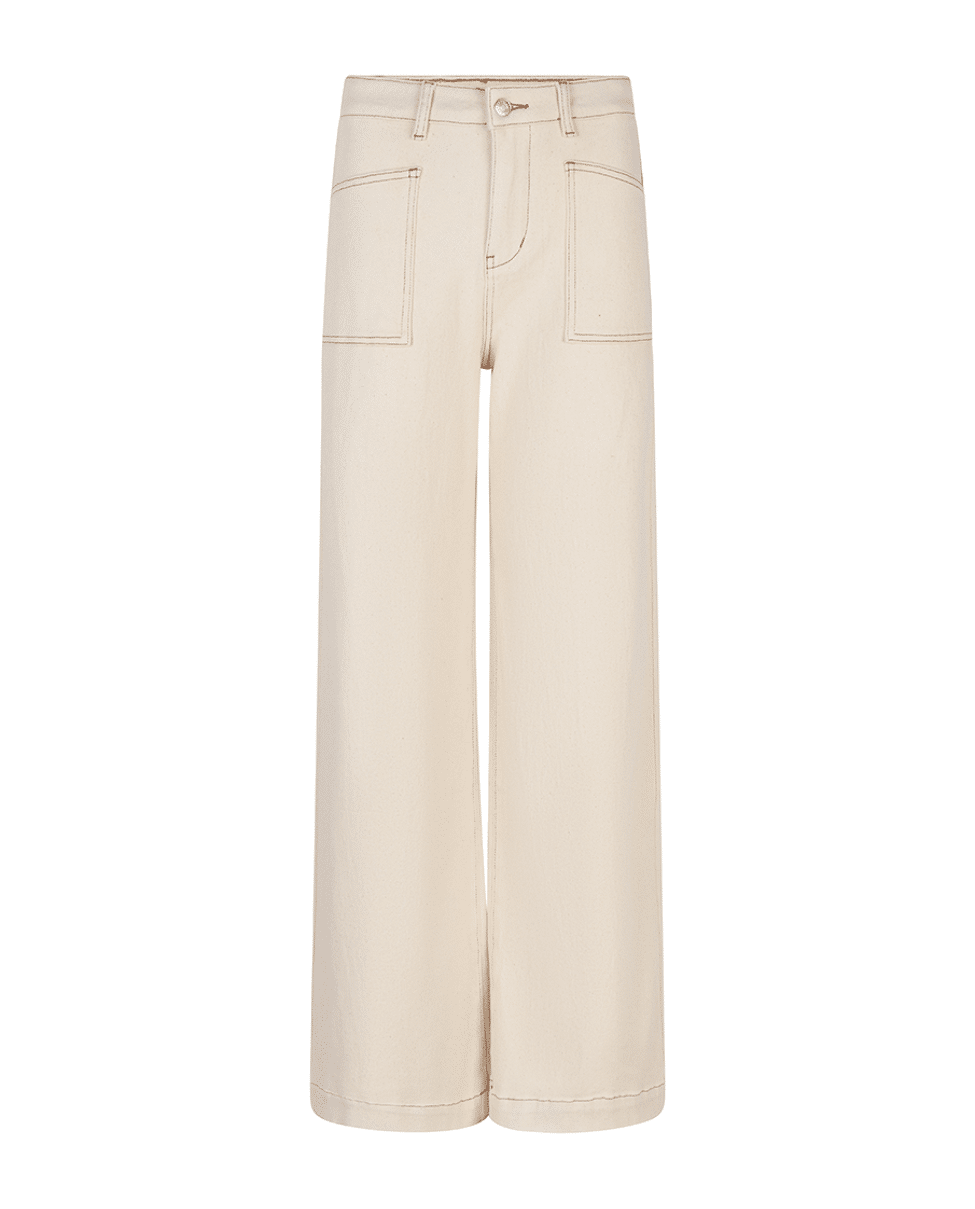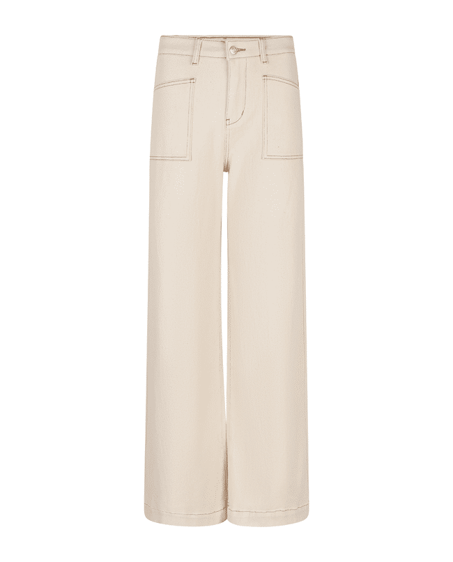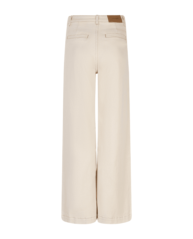 Een wide leg broek in natural beige, uitgevoerd in een stevige katoenen twill met een vleugje stretch. Een tijdloos model dat moeiteloos combineert met zowel blouses als T-shirts.