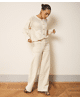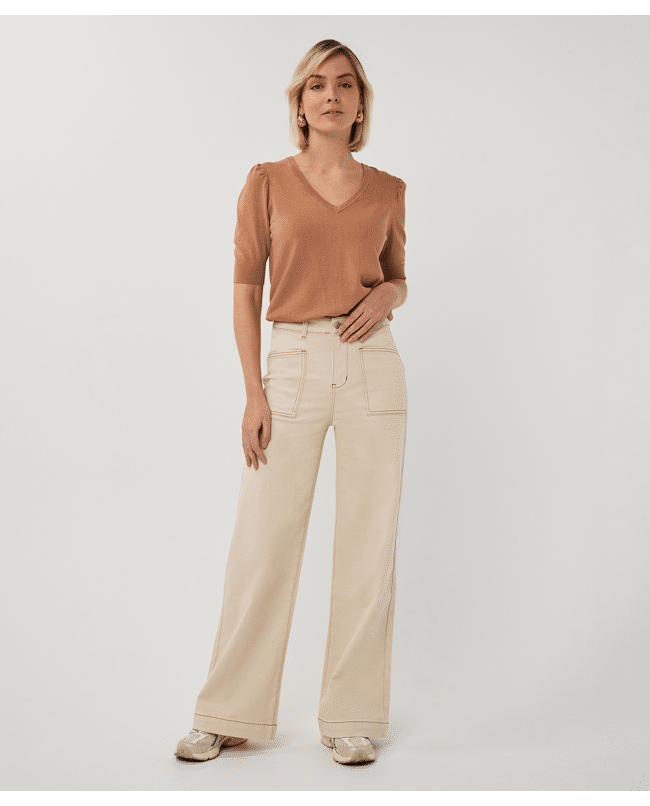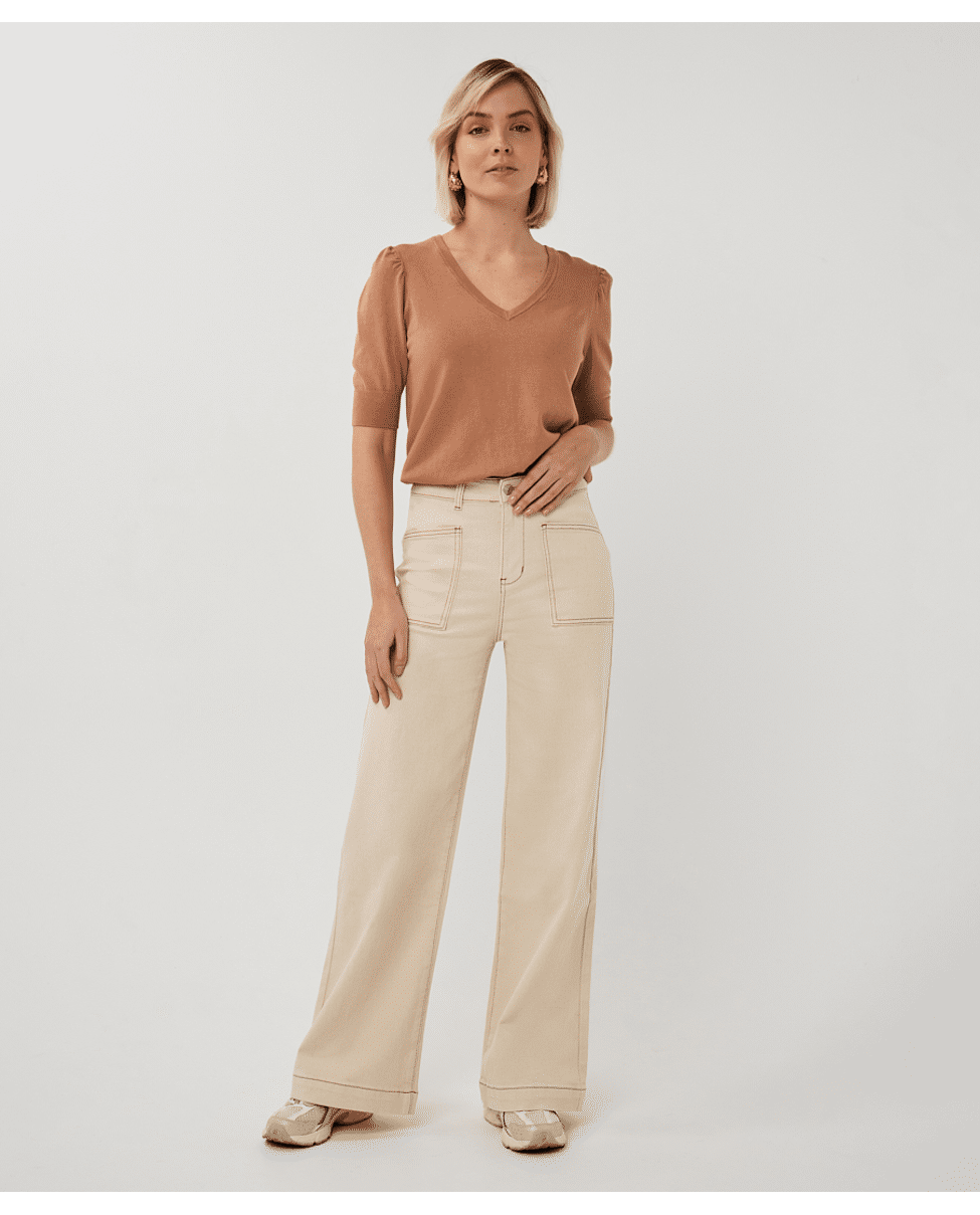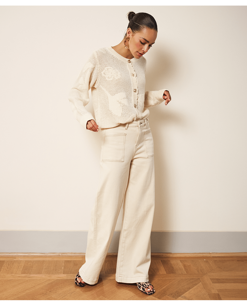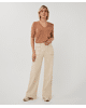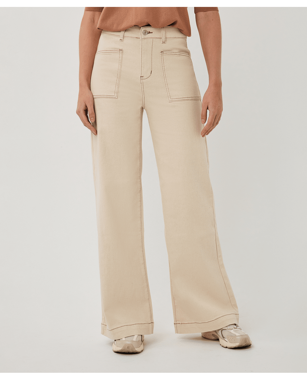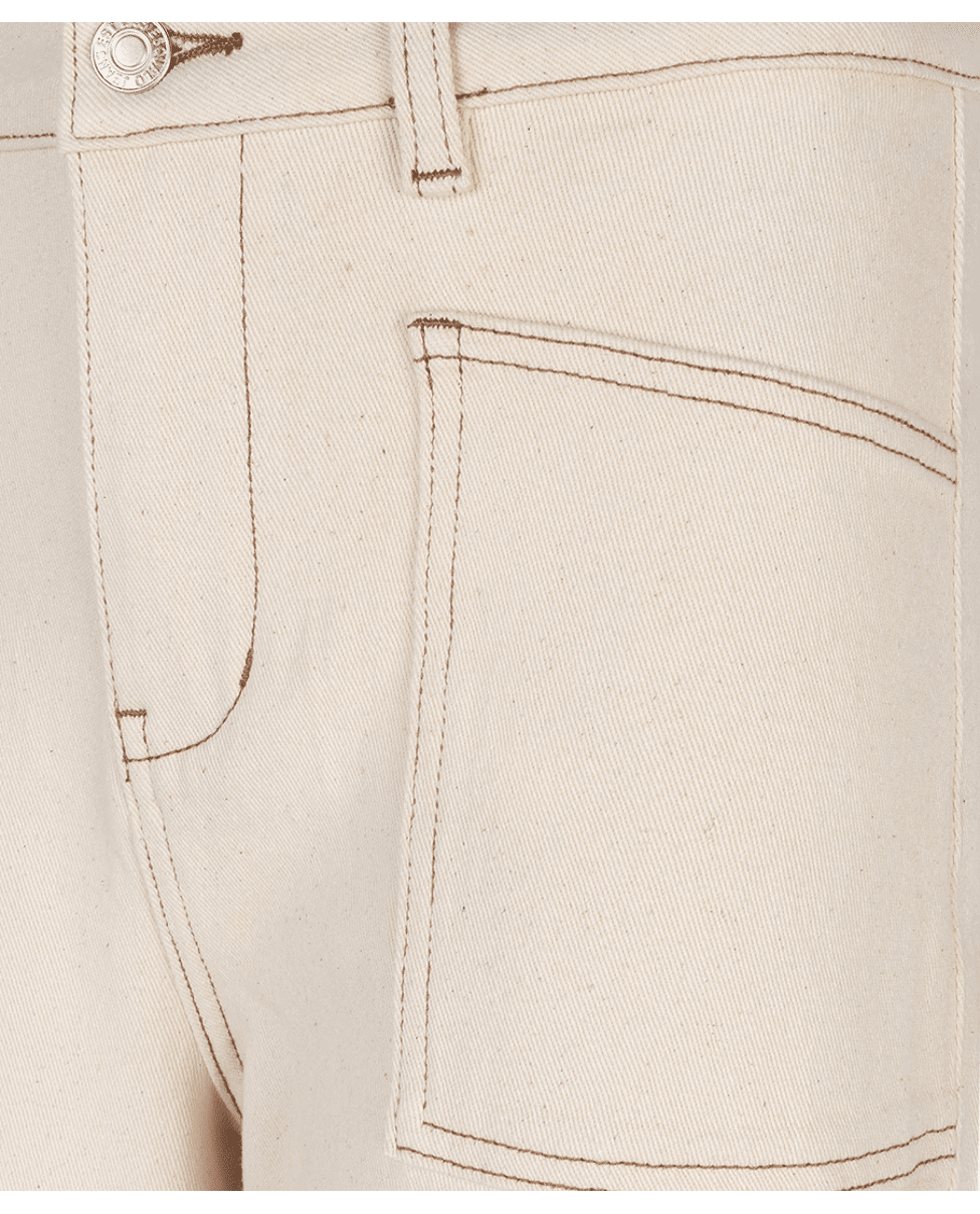 Een wide leg broek in natural beige, uitgevoerd in een stevige katoenen twill met een vleugje stretch. Een tijdloos model dat moeiteloos combineert met zowel blouses als T-shirts.